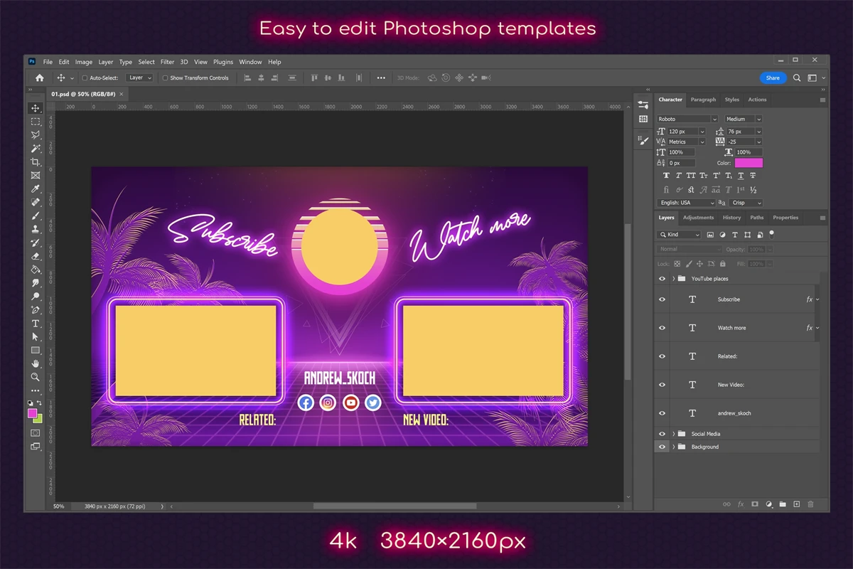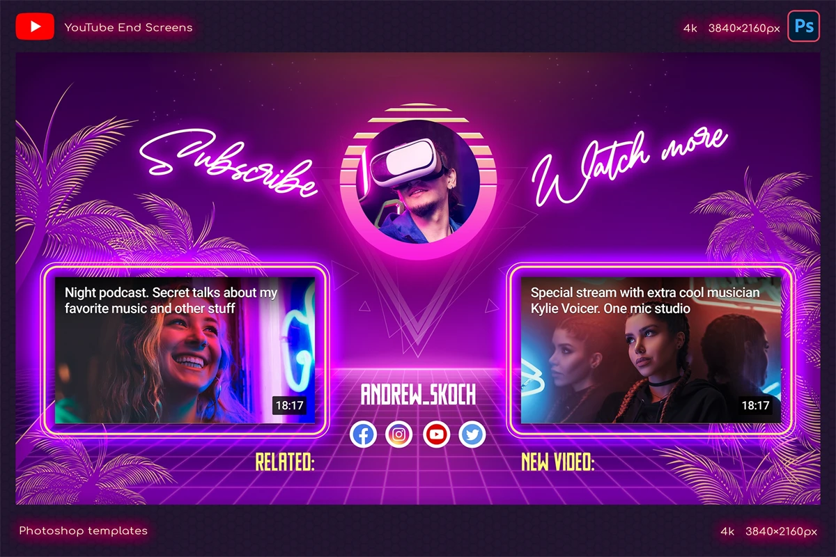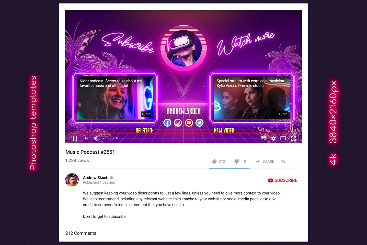 Great for video bloggers, video makers, video creators, YouTube creators, podcasters, talk shows, YouTube podcasts. Special places for new video, related video, playlist and YouTube profile avatar. Nostalgic design in 80s style, with palms and sunset, violet and purple colors.