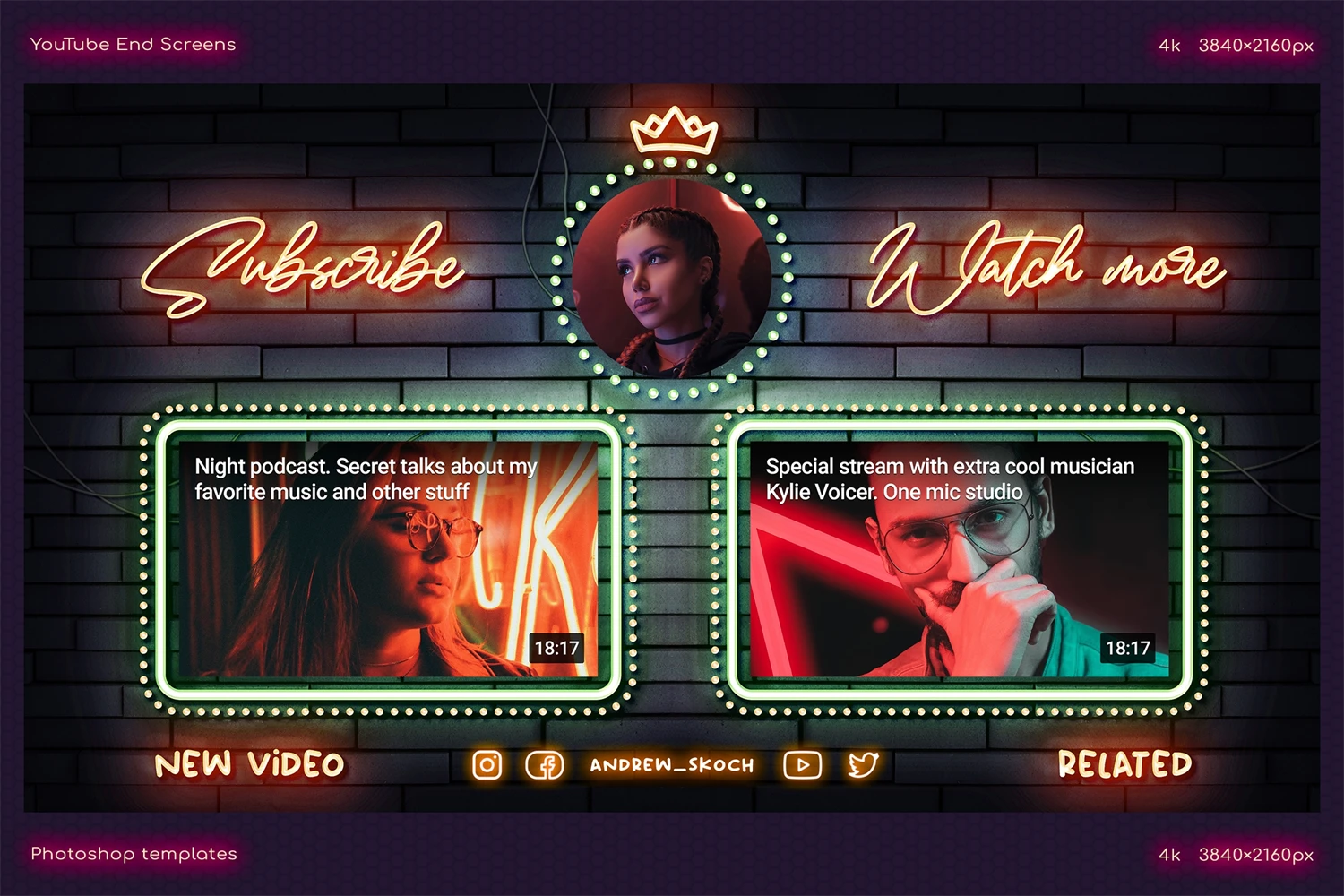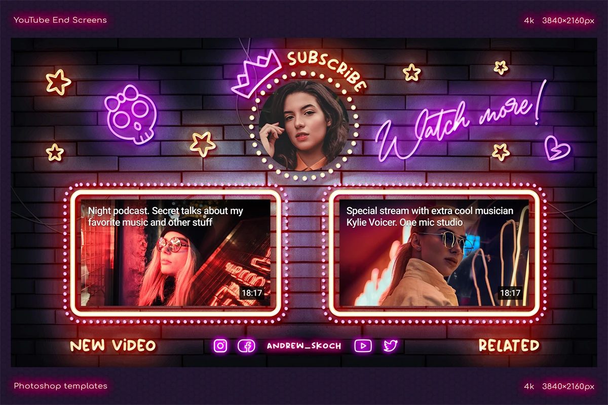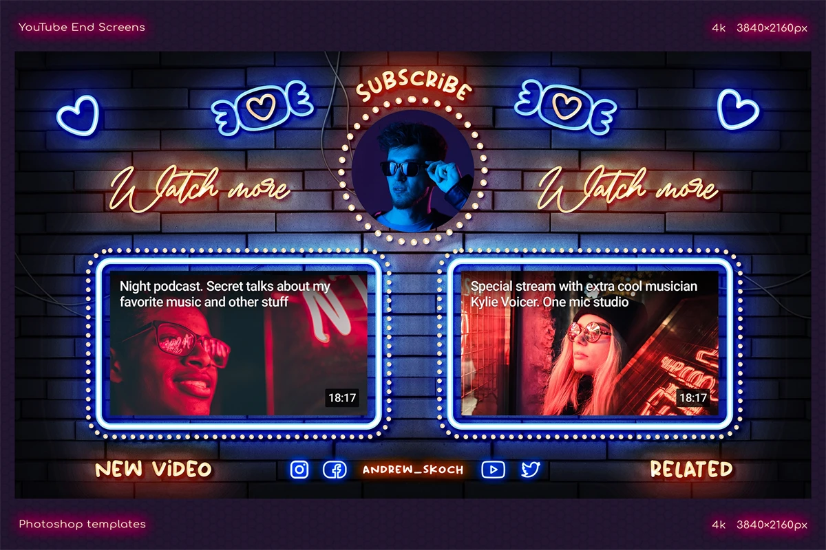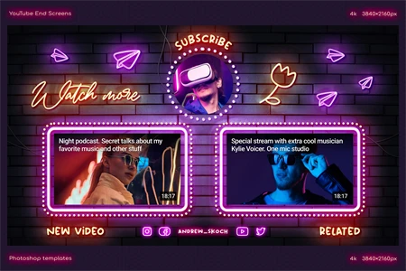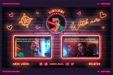 Create cool end screens for your YouTube videos within couple minutes! It's so easy! Editable neon texts. Great for video bloggers, video makers, video creators, YouTube creators, podcasters, talk shows, YouTube podcasts. Special places for new video, related video, playlist and YouTube profile avatar.