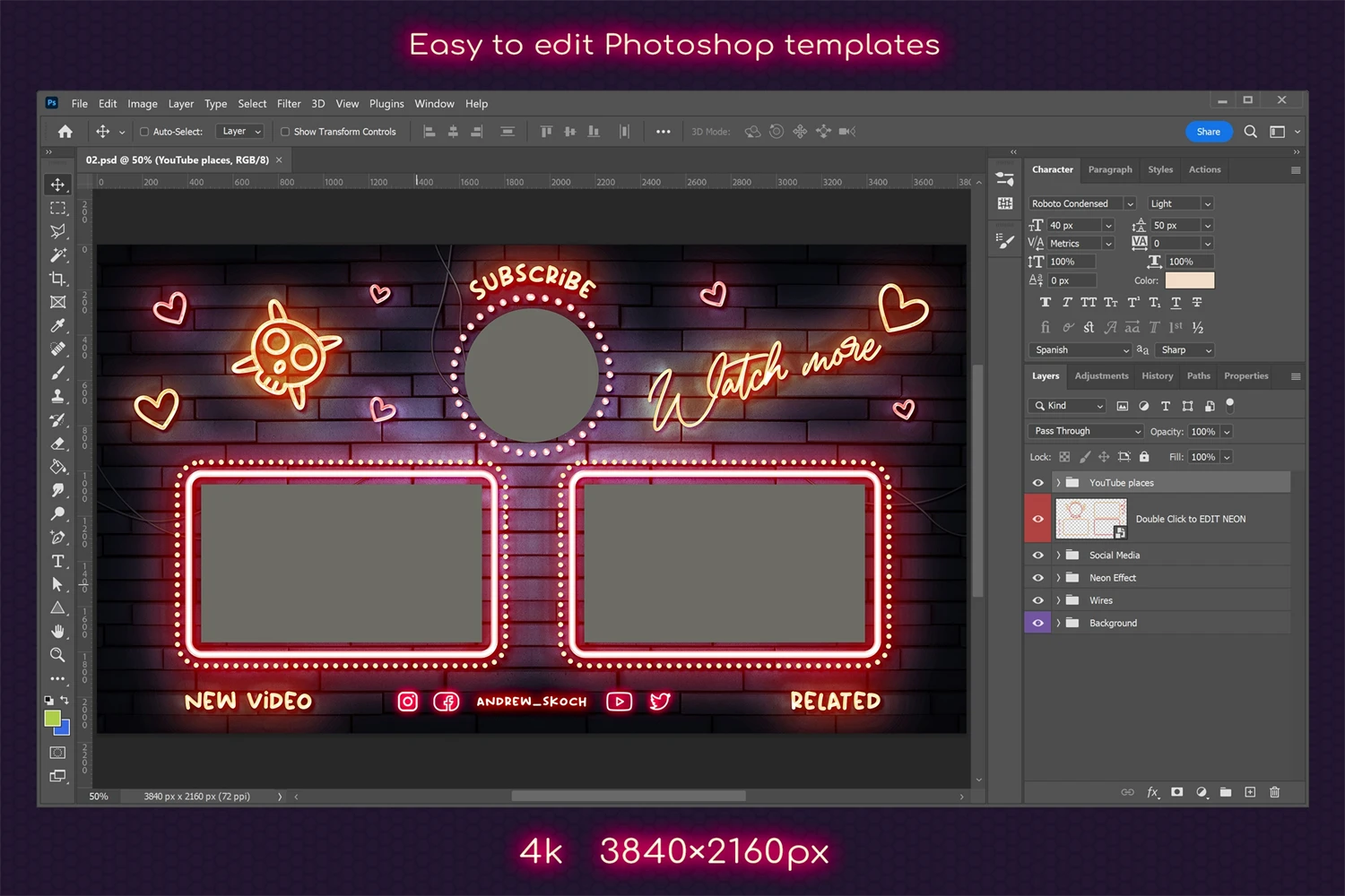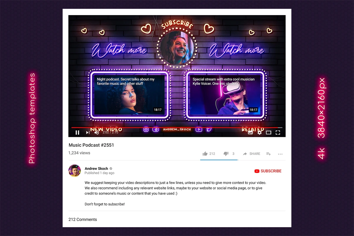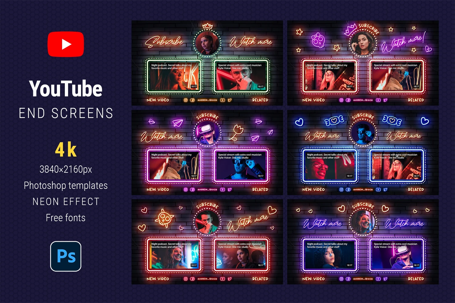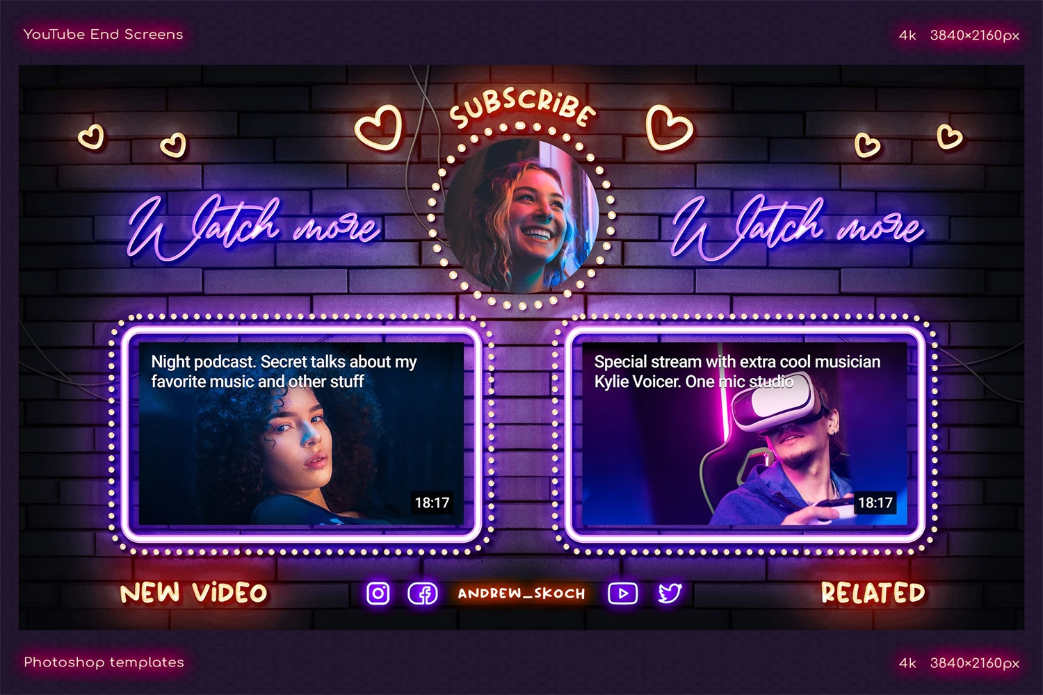 Create cool end screens for your YouTube videos within couple minutes! It's so easy! Editable neon texts. Great for video bloggers, video makers, video creators, YouTube creators, podcasters, talk shows, YouTube podcasts. Special places for new video, related video, playlist and YouTube profile avatar.