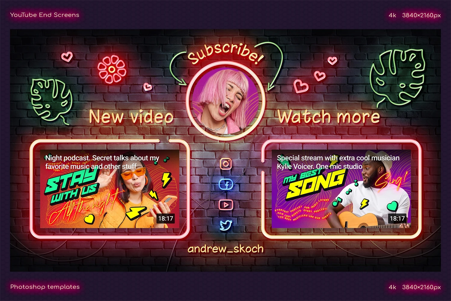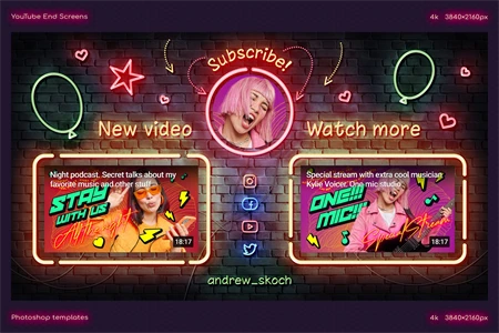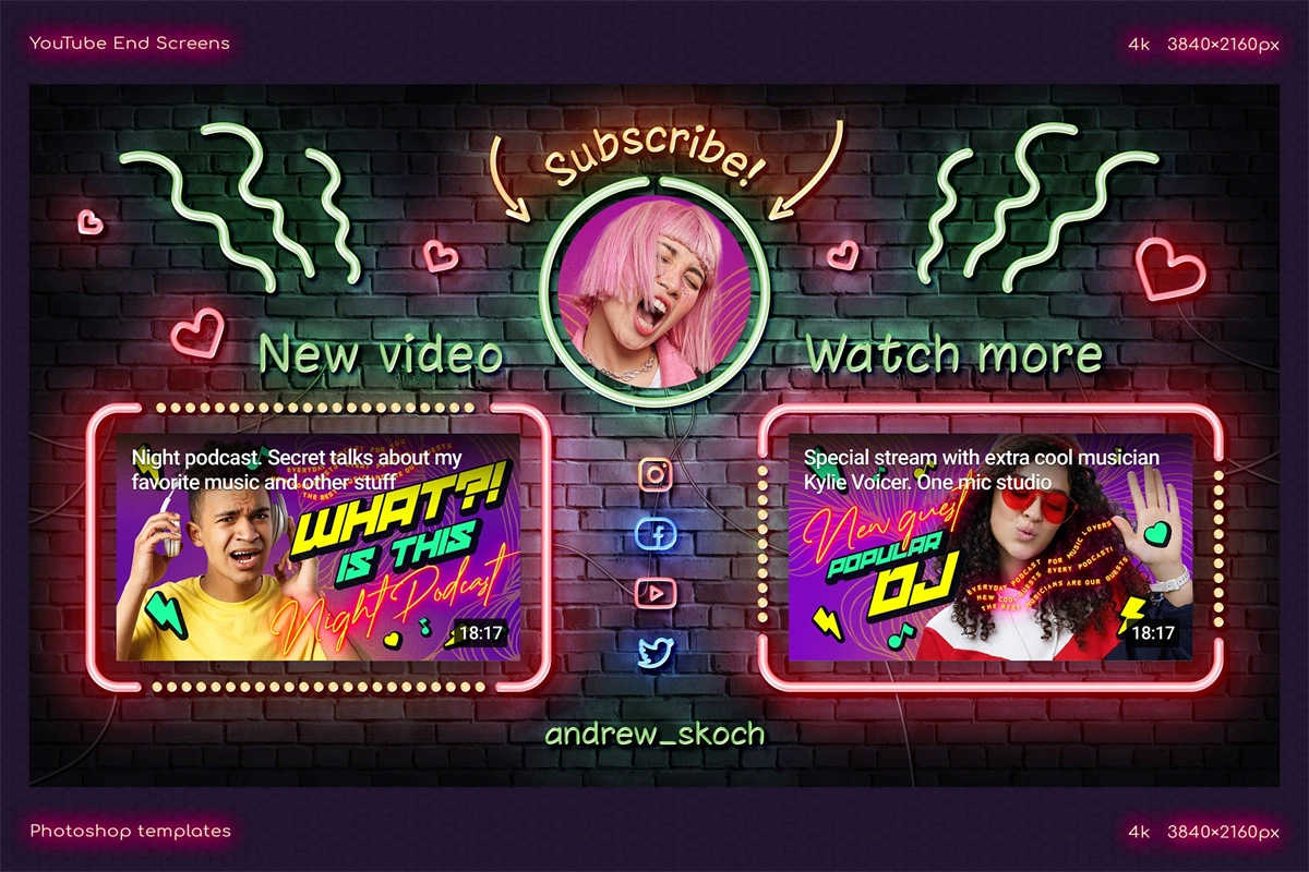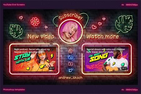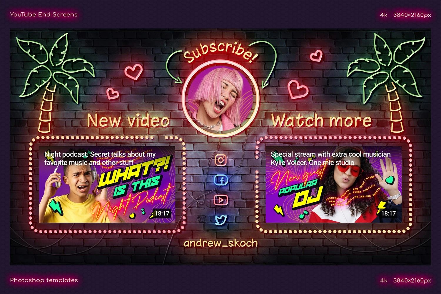 Editable neon texts. Great for video bloggers, video makers, video creators, YouTube creators, podcasters, talk shows, YouTube podcasts. Special places for new video, related video, playlist and YouTube profile avatar.