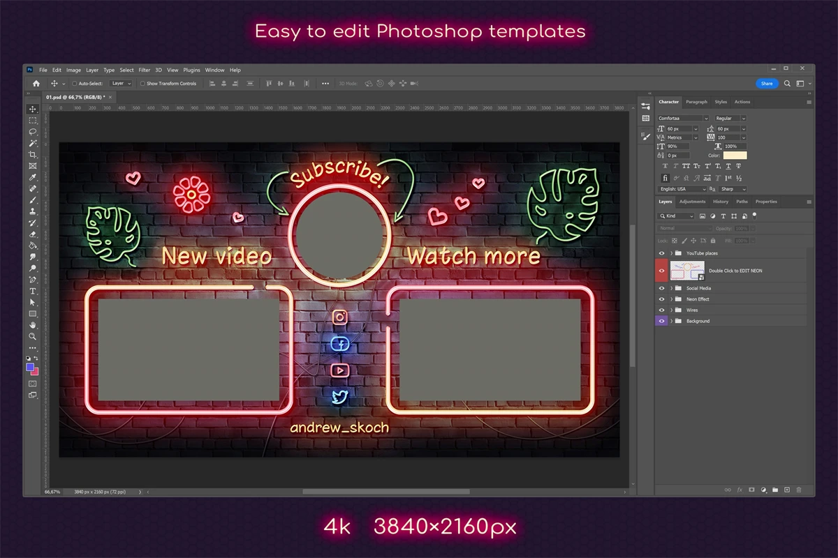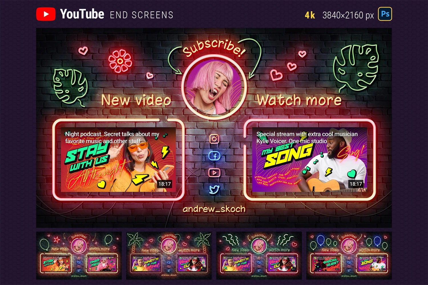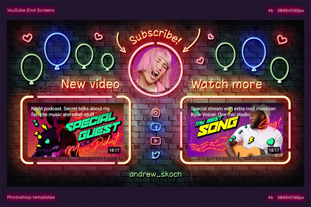 Editable neon texts. Great for video bloggers, video makers, video creators, YouTube creators, podcasters, talk shows, YouTube podcasts. Special places for new video, related video, playlist and YouTube profile avatar.