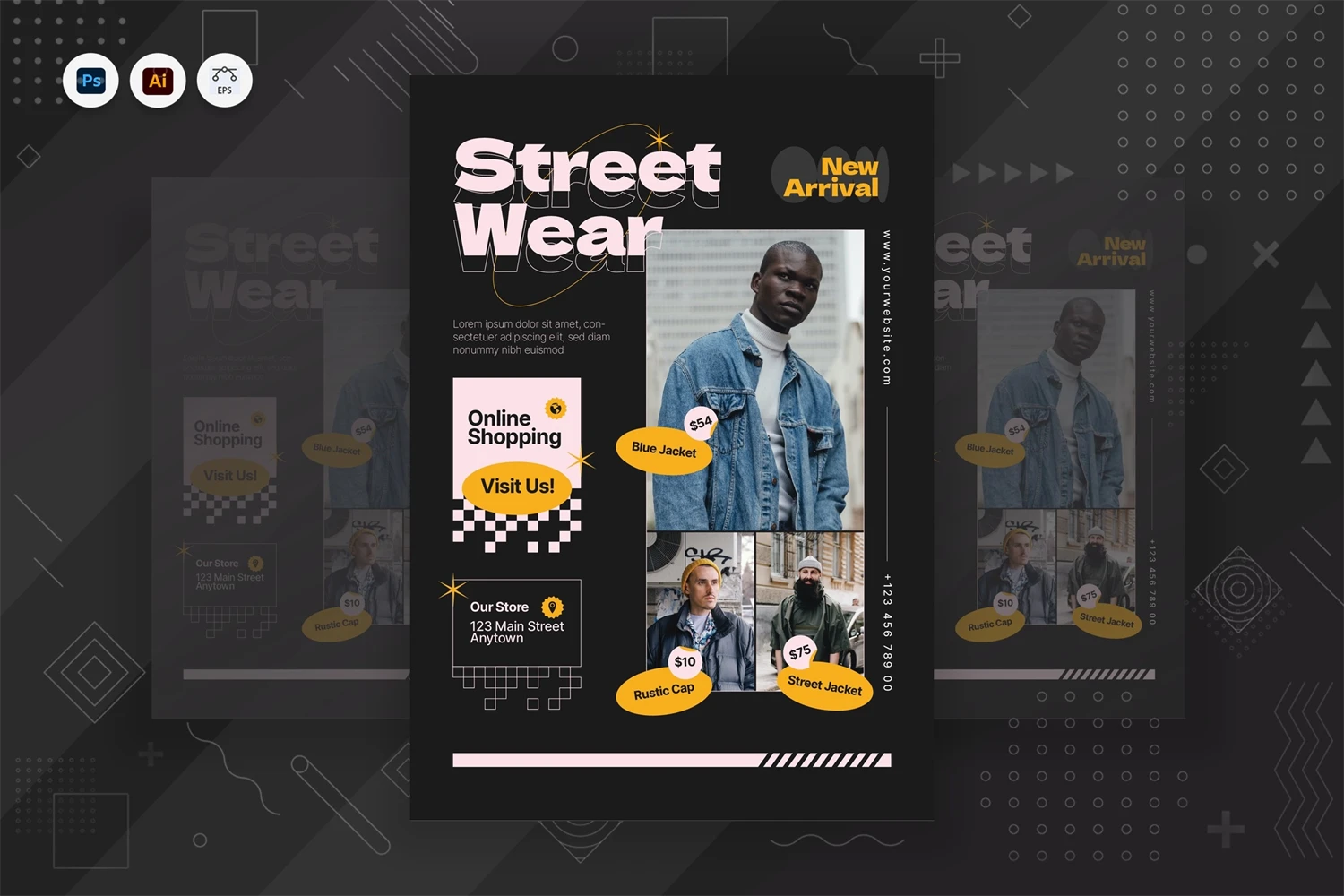 Here is our business Poster template! This is creative and corporate style Poster template, **New Arrival Fashion Street Wear Poster**- Get it now!,great Poster template for All business and personal needs. All elements on this template are editable from Ai & EPS tools, input your content, replace your image with a placeholder, change the color, and, all templates include professional layouts and present your template to the world. This design will great for promoting Specification