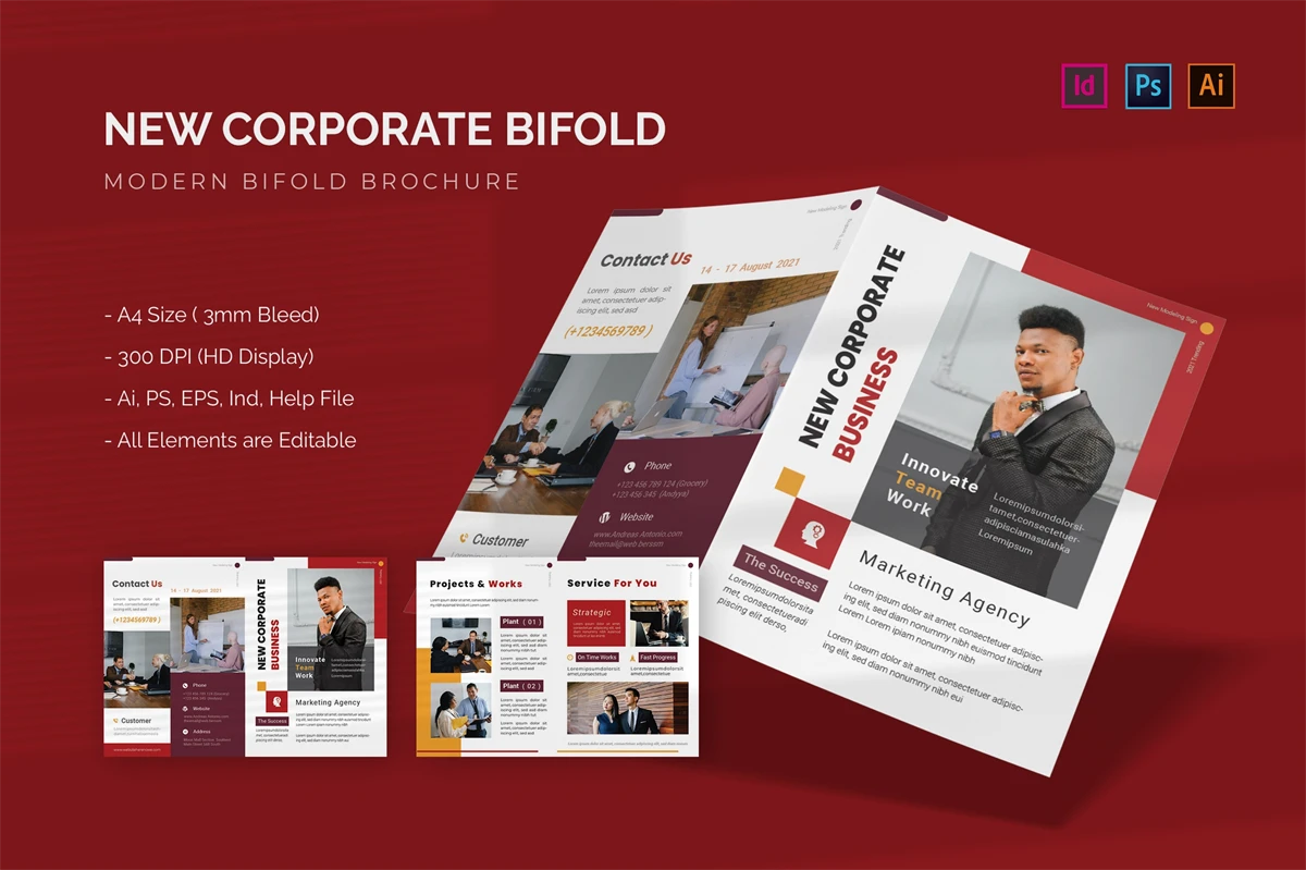 New Corporate Business - Bifold Brochure We present this Bifold Brochure for you, simple and very elegant, and this Bifold Brochure is suitable for all types of your business, made with Adobe InDesign (INDD), Adobe Photoshop (PSD) and Adobe Illustrator (AI), very easy to customize, Hope you Like it, dont forget to rate, Thanks.