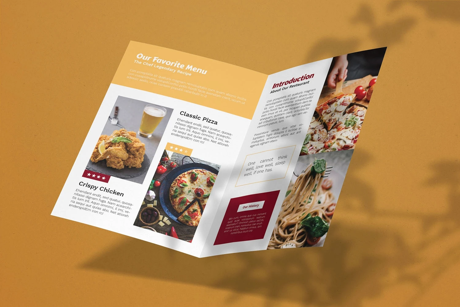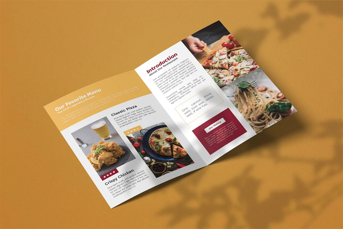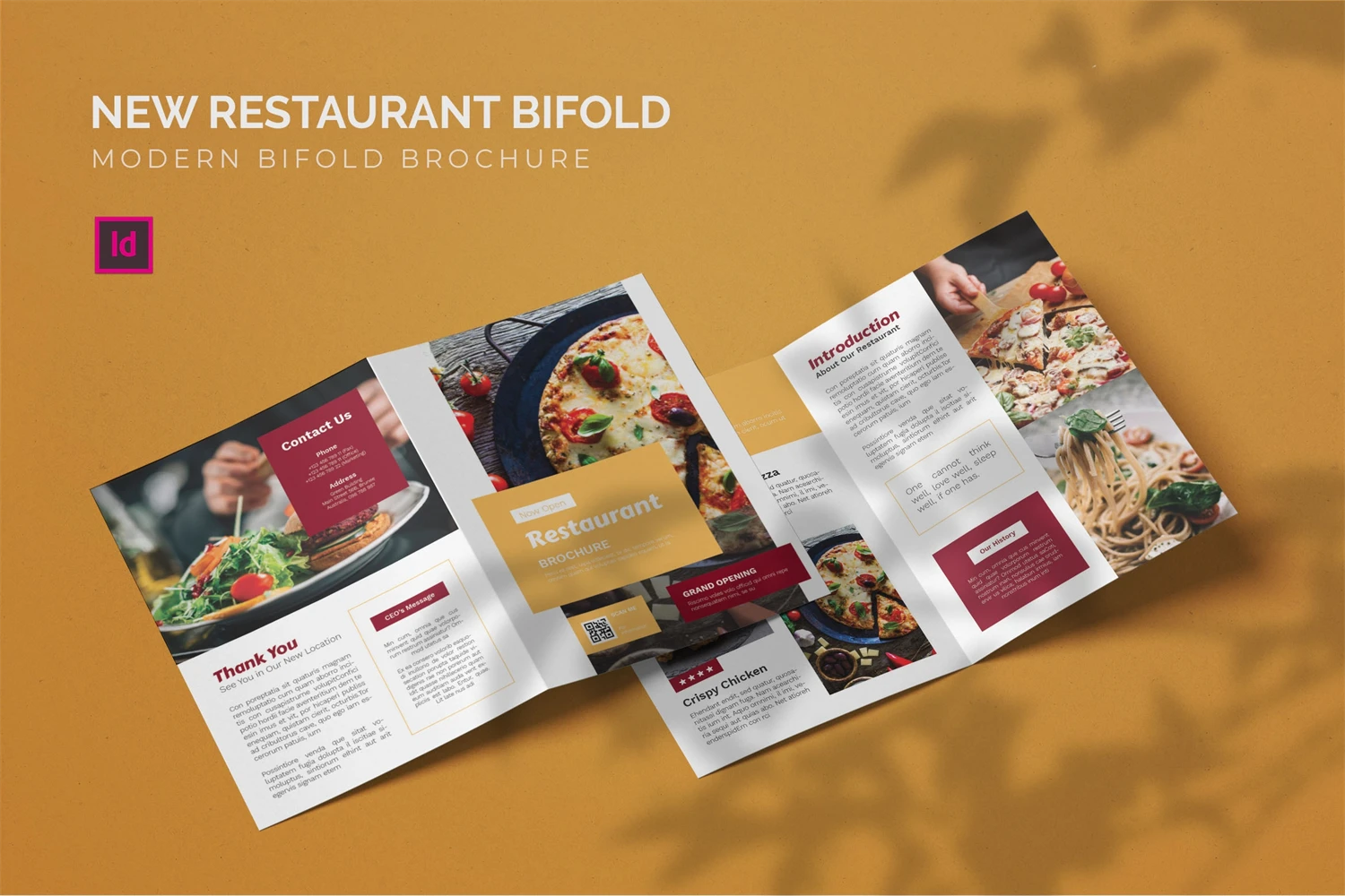 New Restaurant - Bifold Brochure We present this Bifold Brochure for you, simple and very elegant, and this Bifold Brochure is suitable for all types of your business, made with adobe inDesign, very easy to customize, Hope you Like it, dont forget to rate, Thanks.