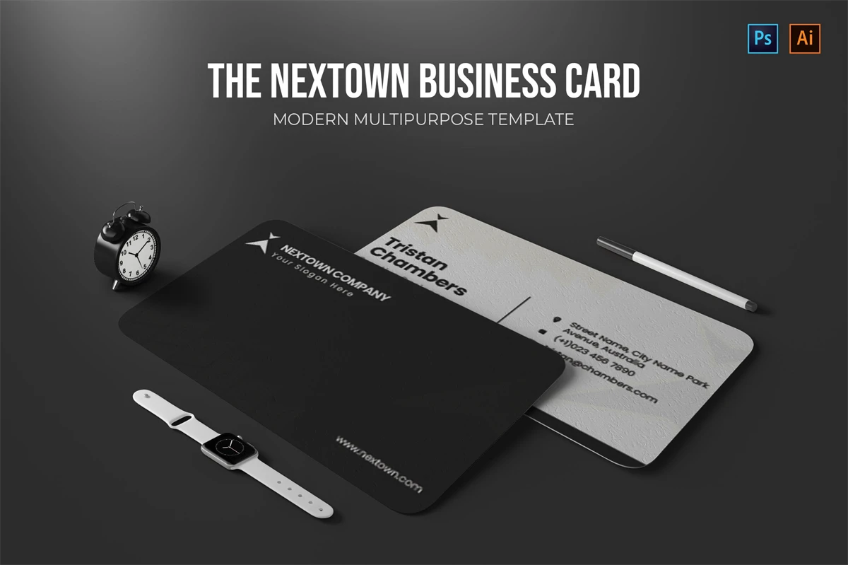This Nextown Company - Business Card make your business cards look professional. You can use this business card for, identity, company business cards, Corporate Business, Creative, Blogs, Photographers, Artists, Designers, etc.