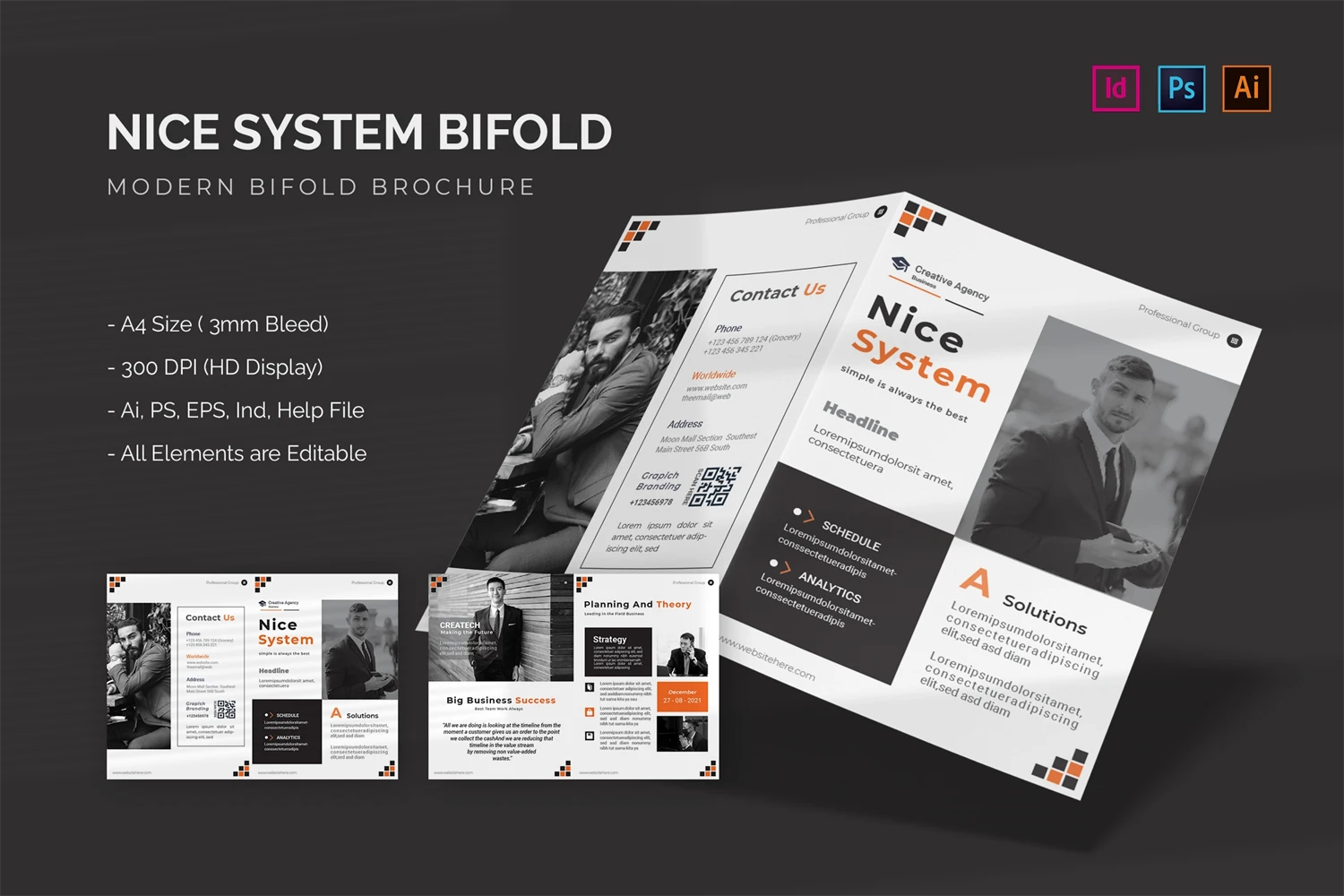Nice System - Bifold Brochure We present this Bifold Brochure for you, simple and very elegant, and this Bifold Brochure is suitable for all types of your business, made with Adobe InDesign (INDD), Adobe Photoshop (PSD) and Adobe Illustrator (AI), very easy to customize, Hope you Like it, dont forget to rate, Thanks.