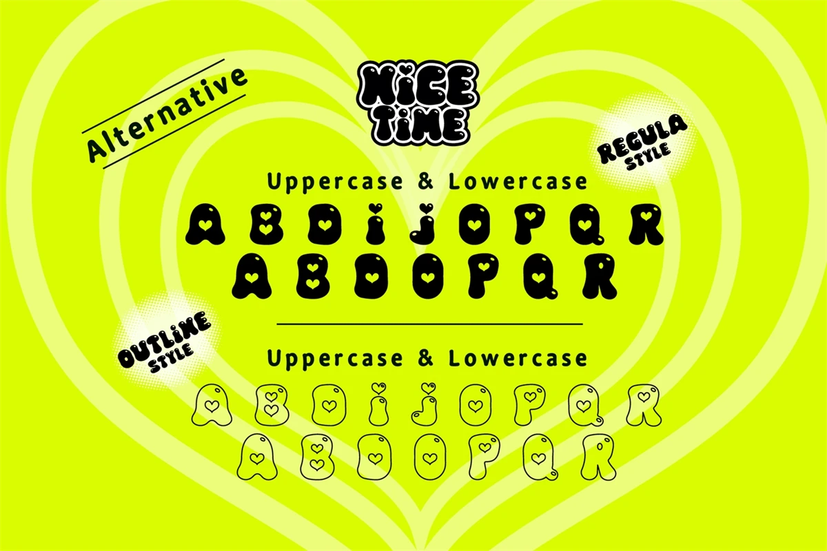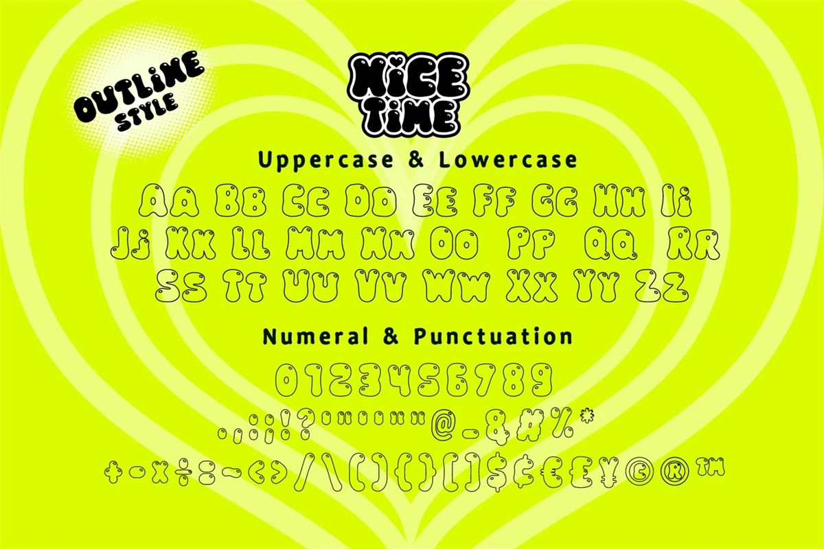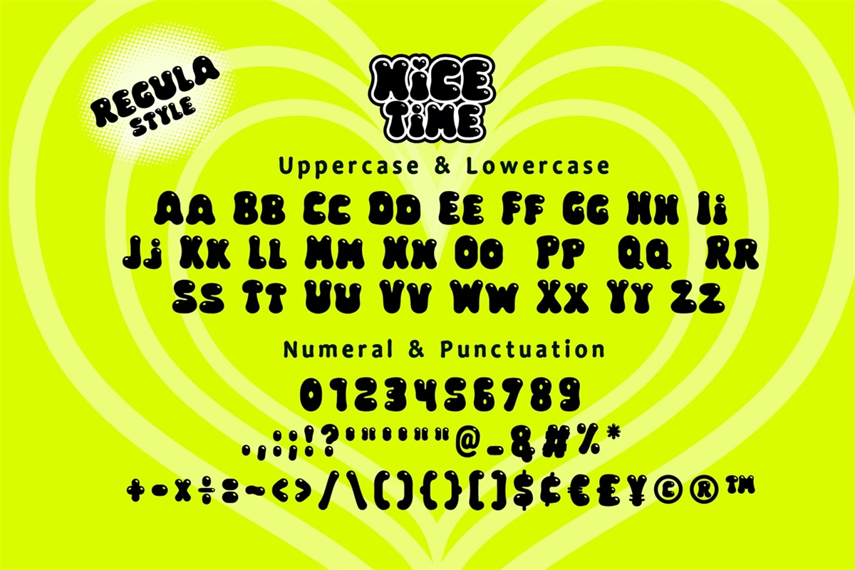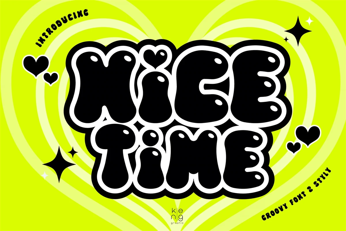 Nice Time is a bold and chunky display font with a great punch. Everything written in this font will be instantly recognizable and will attract attention.