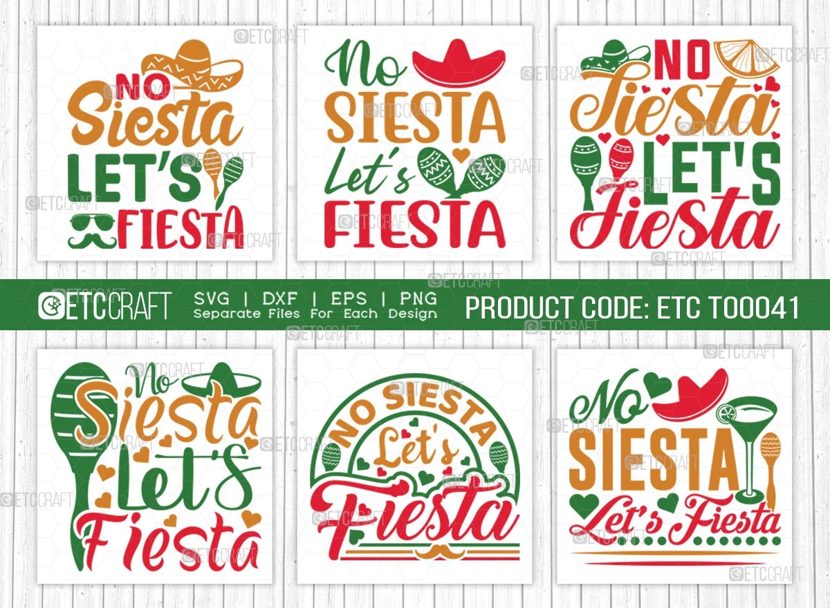 Take your fiesta decor to the next level by incorporating the "No Siesta Let's Fiesta" design into banners, posters, tablecloths, or even custom party favors. Its energetic and vibrant elements will infuse your celebrations with a lively atmosphere.