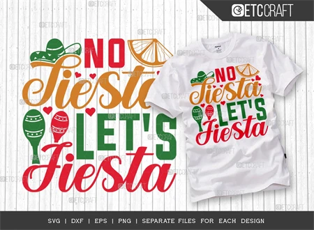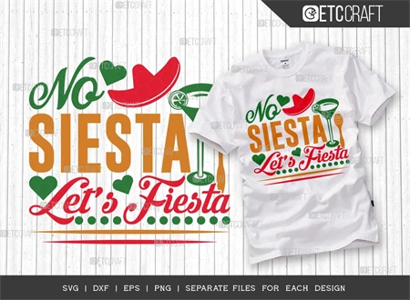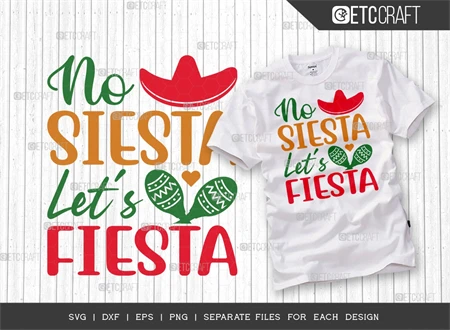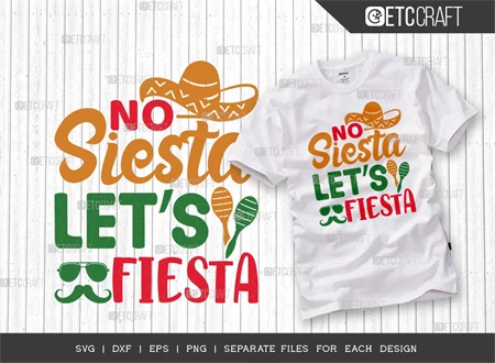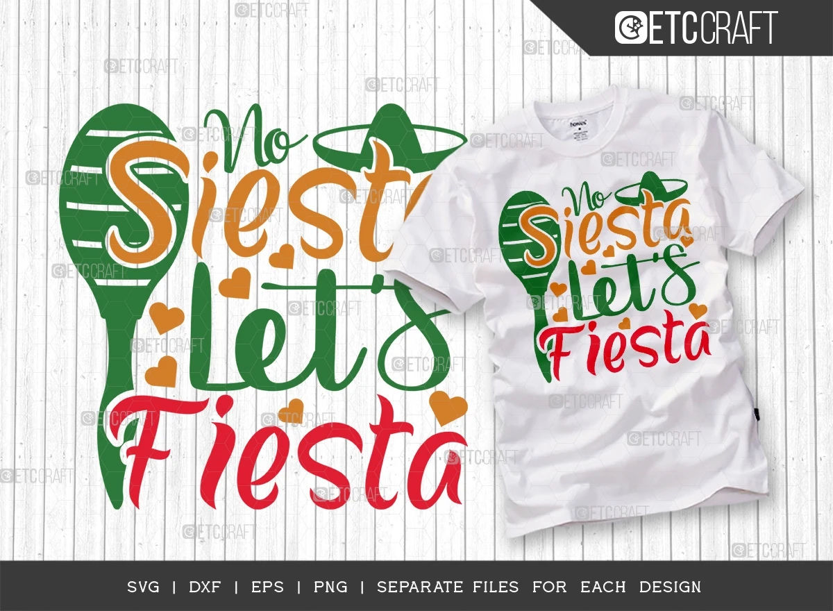 Introducing the vibrant and captivating "No Siesta Let's Fiesta" SVG Bundle T-shirt design, a must-have for those who love to celebrate and embrace the spirit of fiestas! This eye-catching design is perfect for individuals or groups looking to make a statement at parties, events, or simply to showcase their love for all things festive. If you're hosting a fiesta, attending a themed event, or simply looking to showcase your love for Mexican culture, this design is perfect for you.