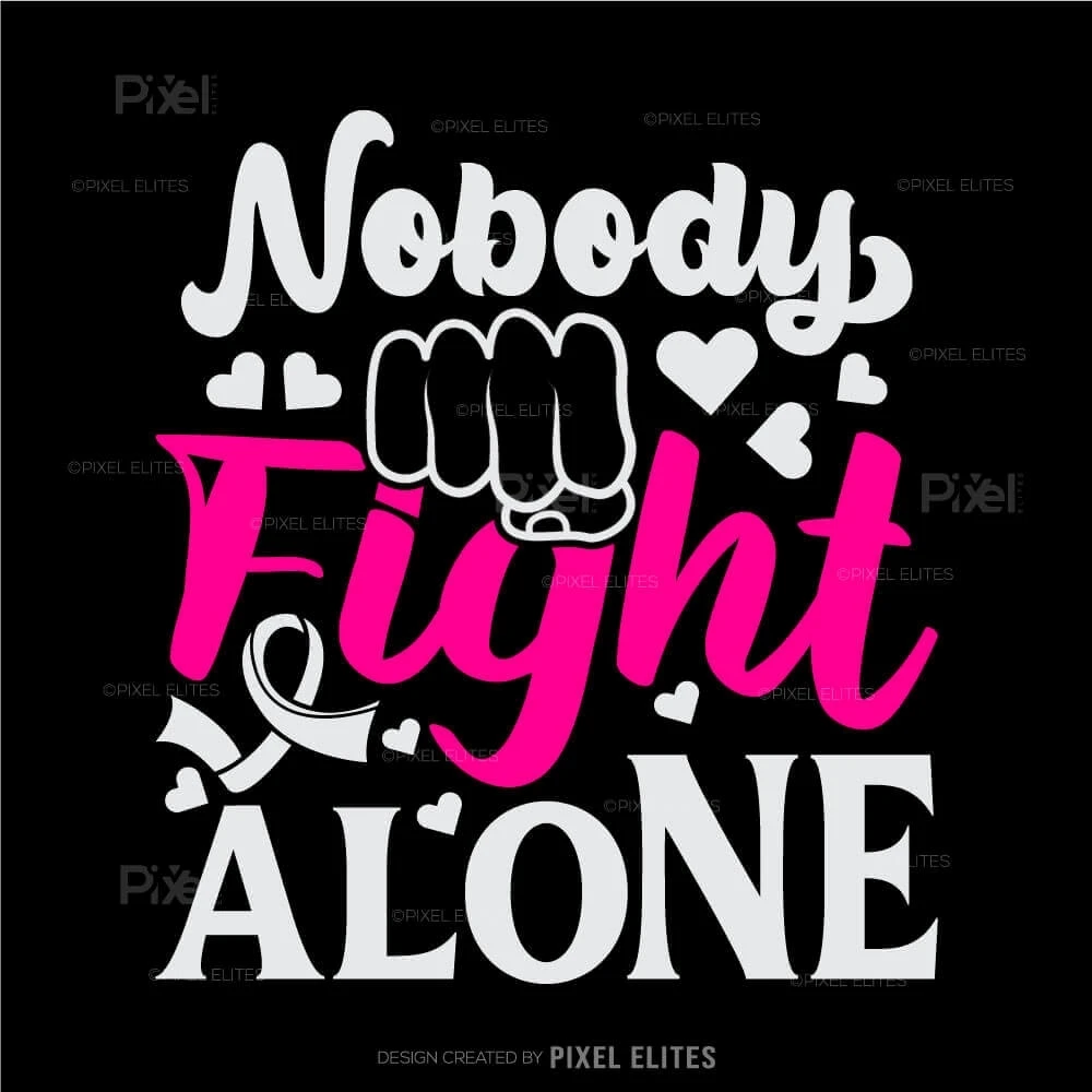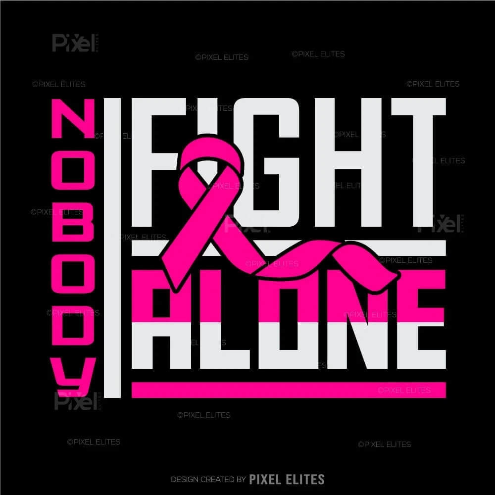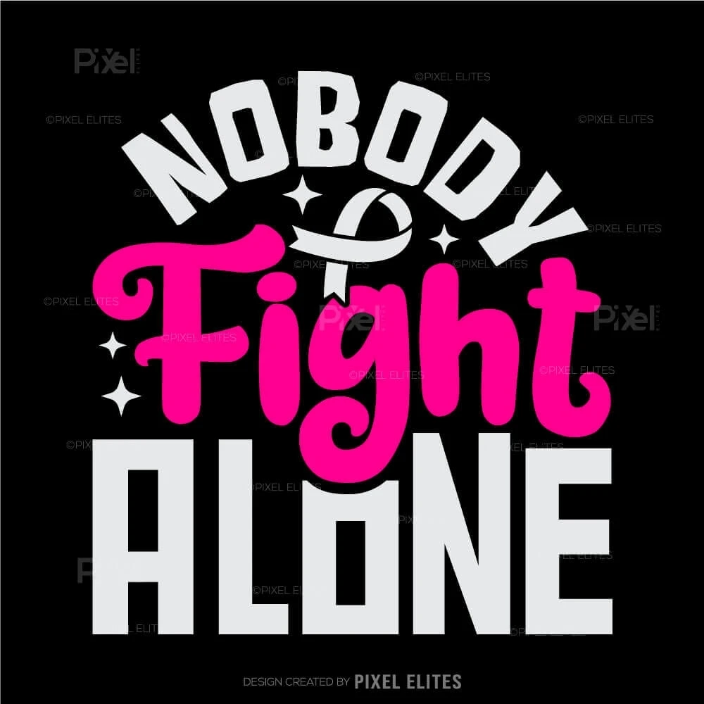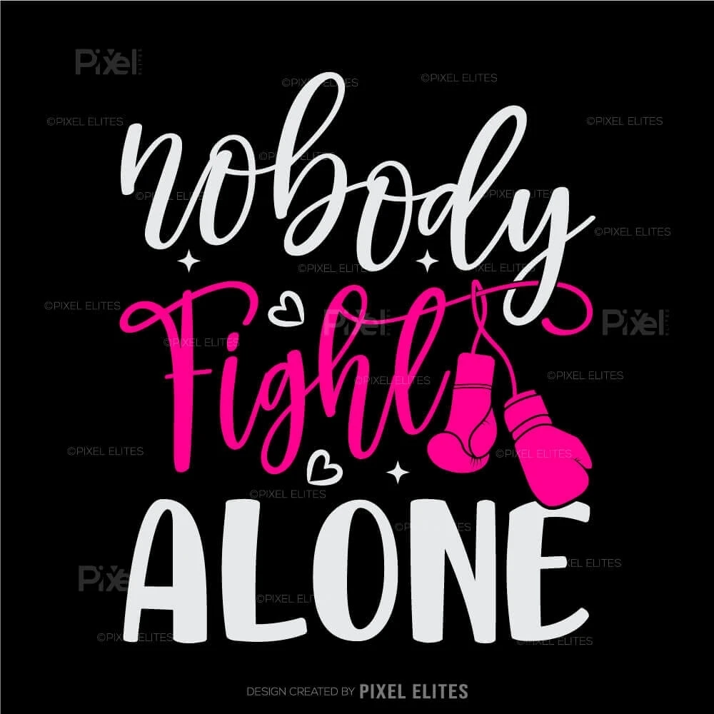 Show your support and solidarity with the Nobody Fights Alone SVG Cut Files for T-Shirt Design. Featuring the iconic pink ribbon and a powerful message, this design is perfect for creating custom apparel and vinyl decals to honor cancer survivors and raise breast cancer awareness.
