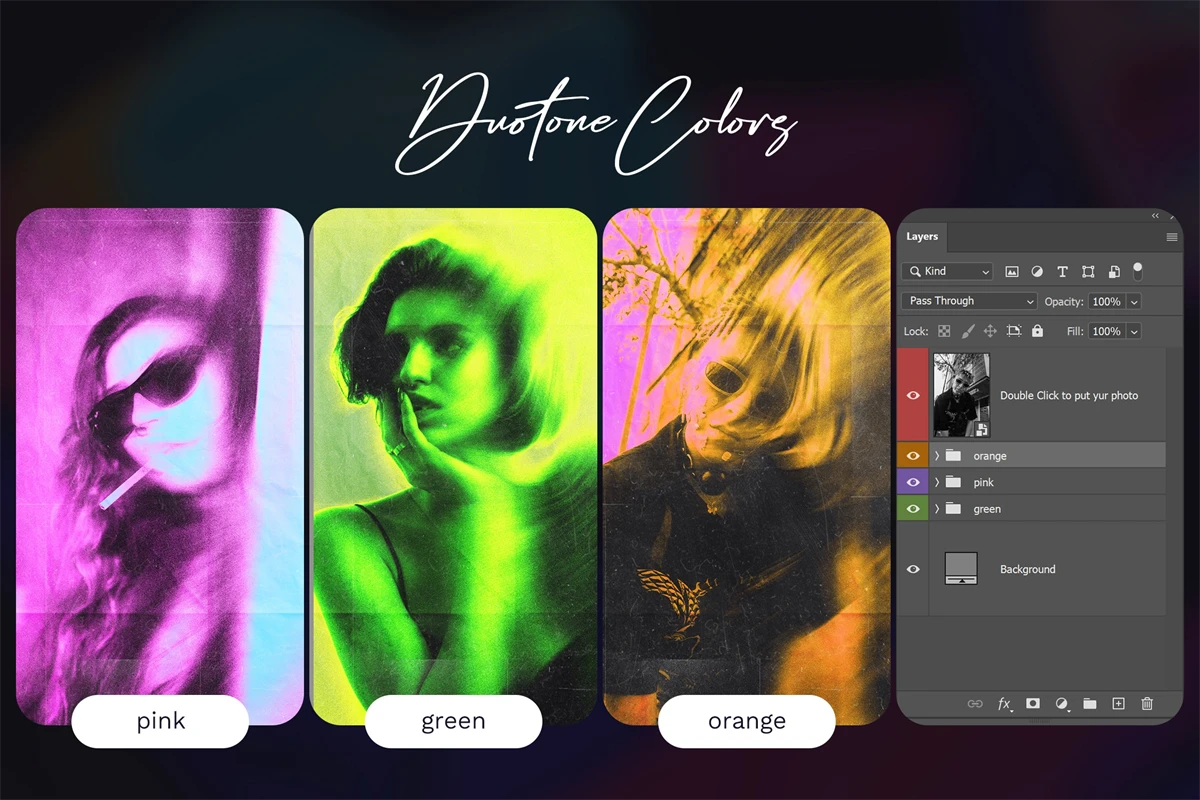The template offers 3 different duotone color options to choose from, giving you the flexibility to create a variety of visual styles. Whether you're looking for a bold and vibrant look or a subtle and understated feel, this template has you covered.
