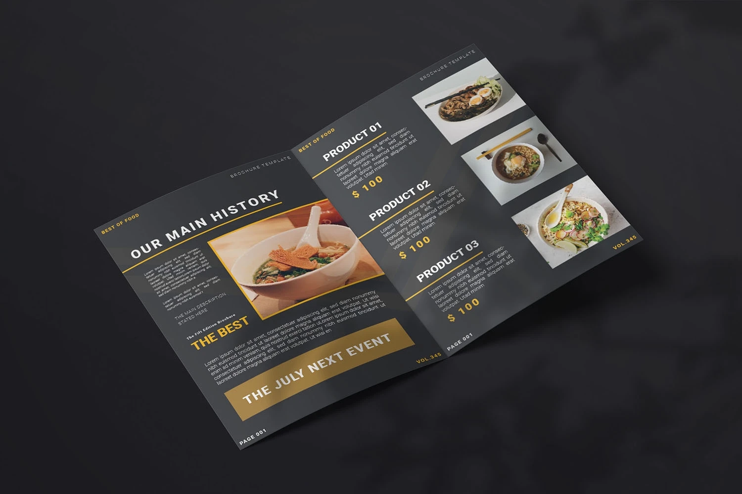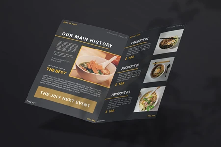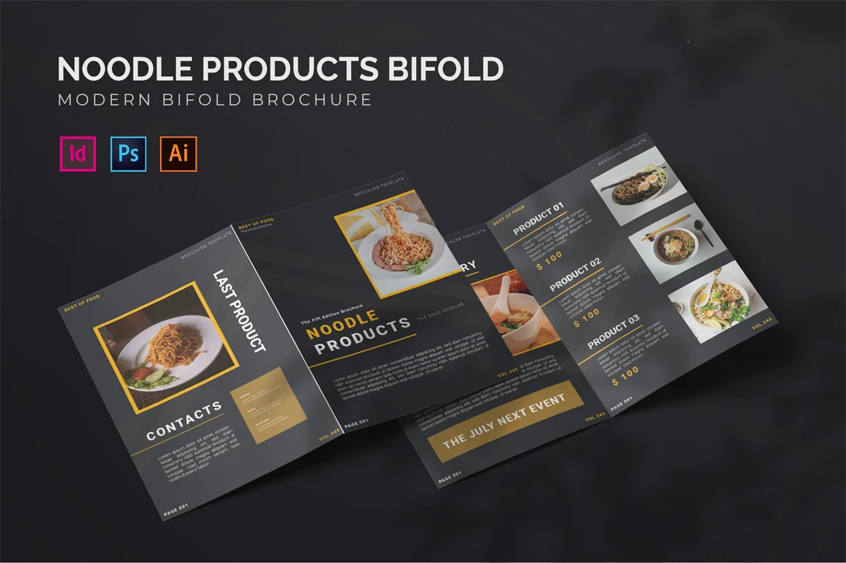 Noodle Products - Bifold Brochure We present this Bifold Brochure for you, simple and very elegant, and this Bifold Brochure is suitable for all types of your business, made with Adobe InDesign (INDD), Adobe Photoshop (PSD) and Adobe Illustrator (AI), very easy to customize, Hope you Like it, dont forget to rate, Thanks.