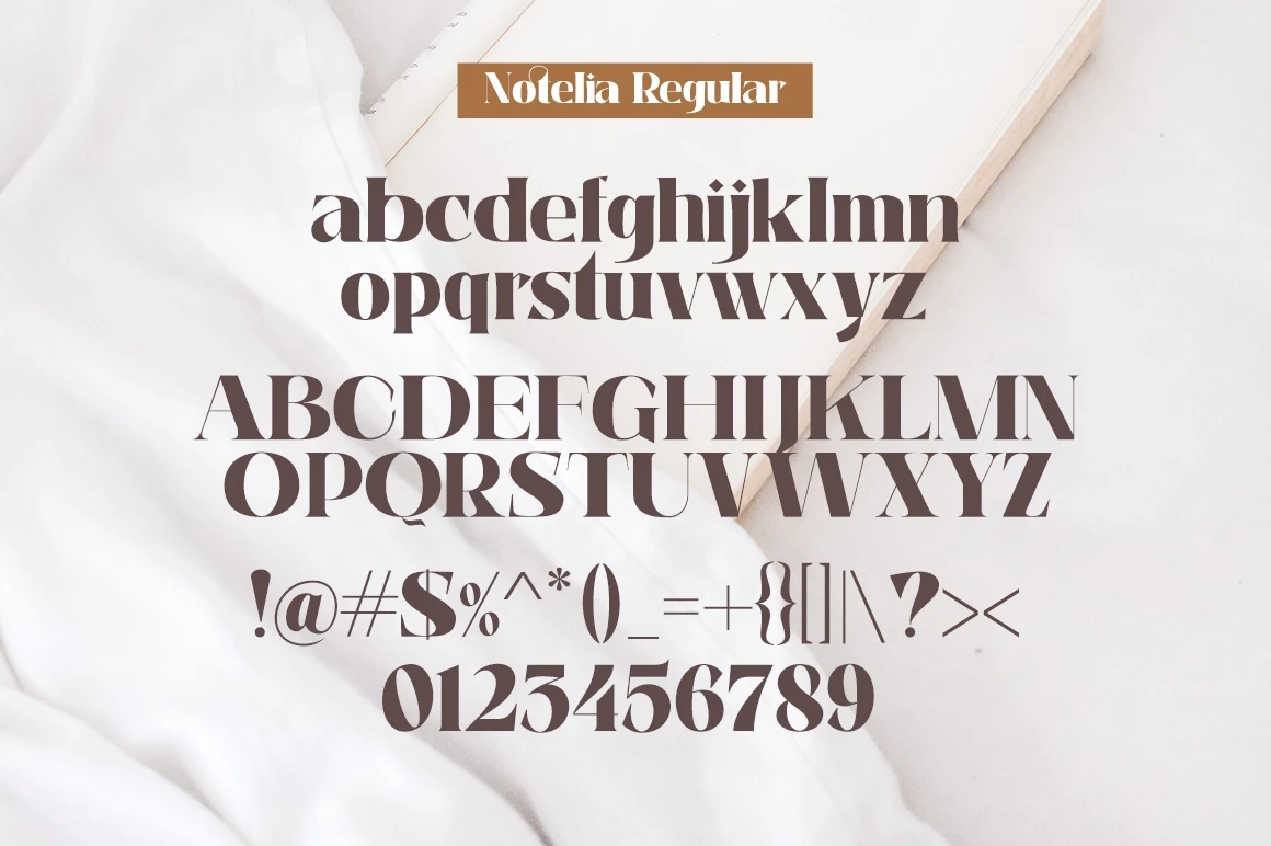 Notelia The elegant font I work with is creative in mood and perfect in shape, inspired by today's beautiful serif look. bold, balanced and varied, born for luxury and beauty. includes uppercase letters, numbers, and a wide variety of punctuation marks. Serif font with a modern style. Made for posters, web design, branding, illustrations, badges and many other works.