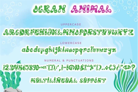 Ocean Animal is a unique display font with sea animal decorations on each letter. Equipped with uppercase letters, lowercase letters, numerals, punctuations and multilingual support. Very suitable for book titles, film titles, comics, posters, banners, logos, branding, stickers and others.