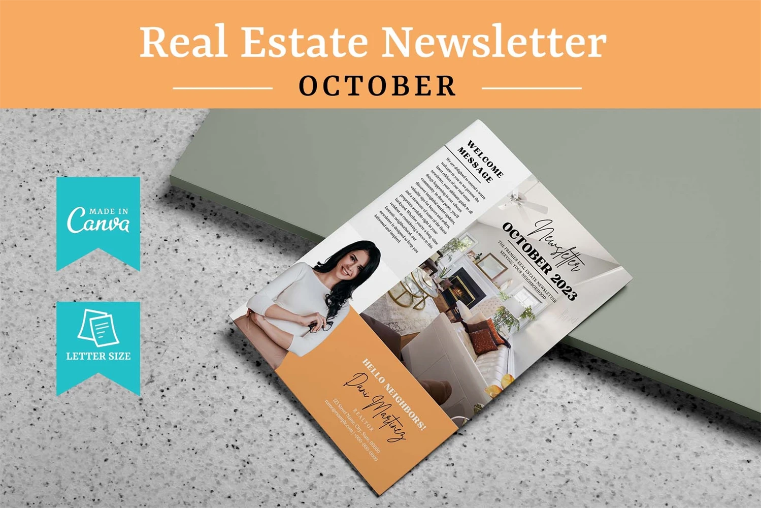 This Canva template offers a dynamic solution for crafting your Real Estate October 2023 newsletter.