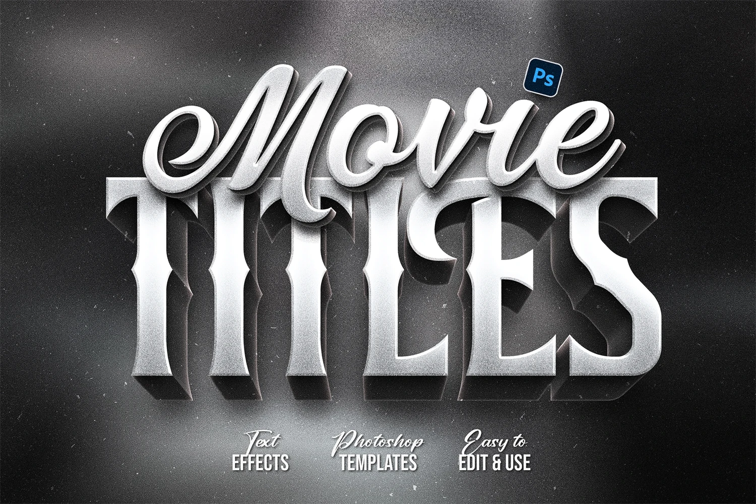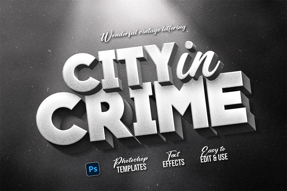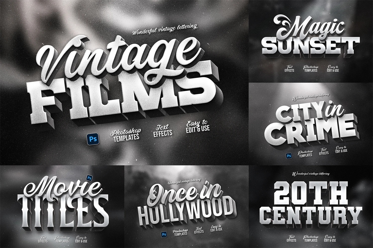 3D effects for your texts, logos, shapes in old movie titles style. Noir detective, gangster saga, scary movie style. You can use these 6 Photoshop templates for making cool retro lettering for posters, social media, video titles, Instagram and Facebook, promo, ads and more!