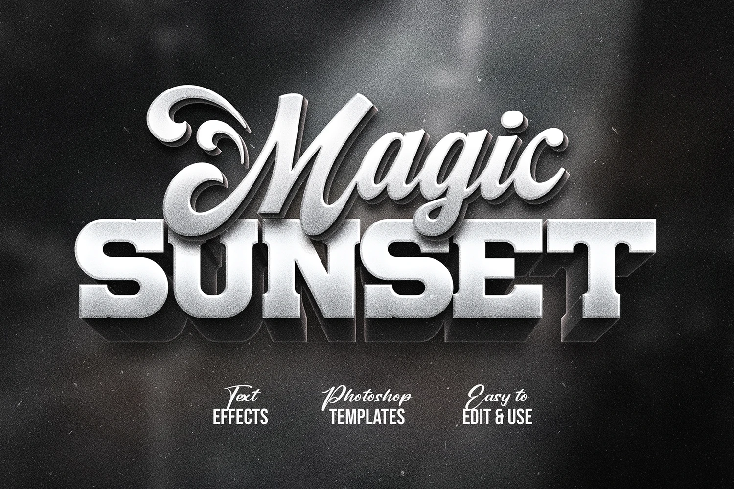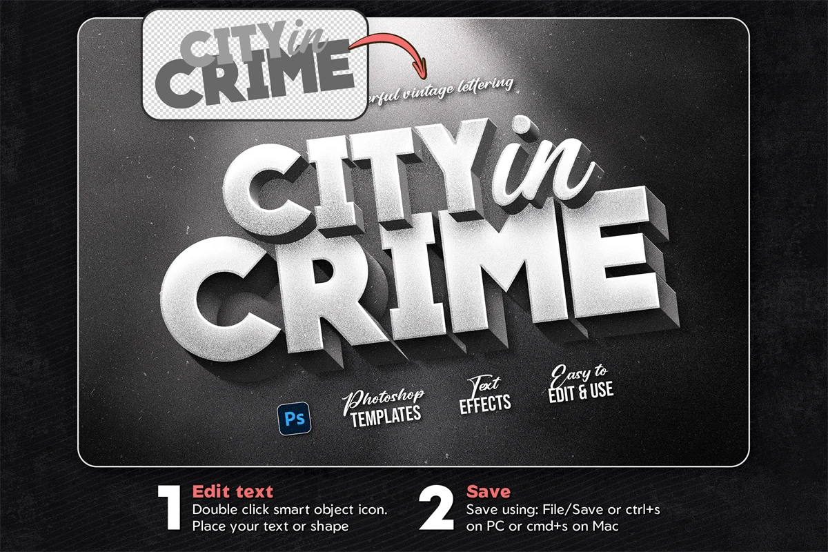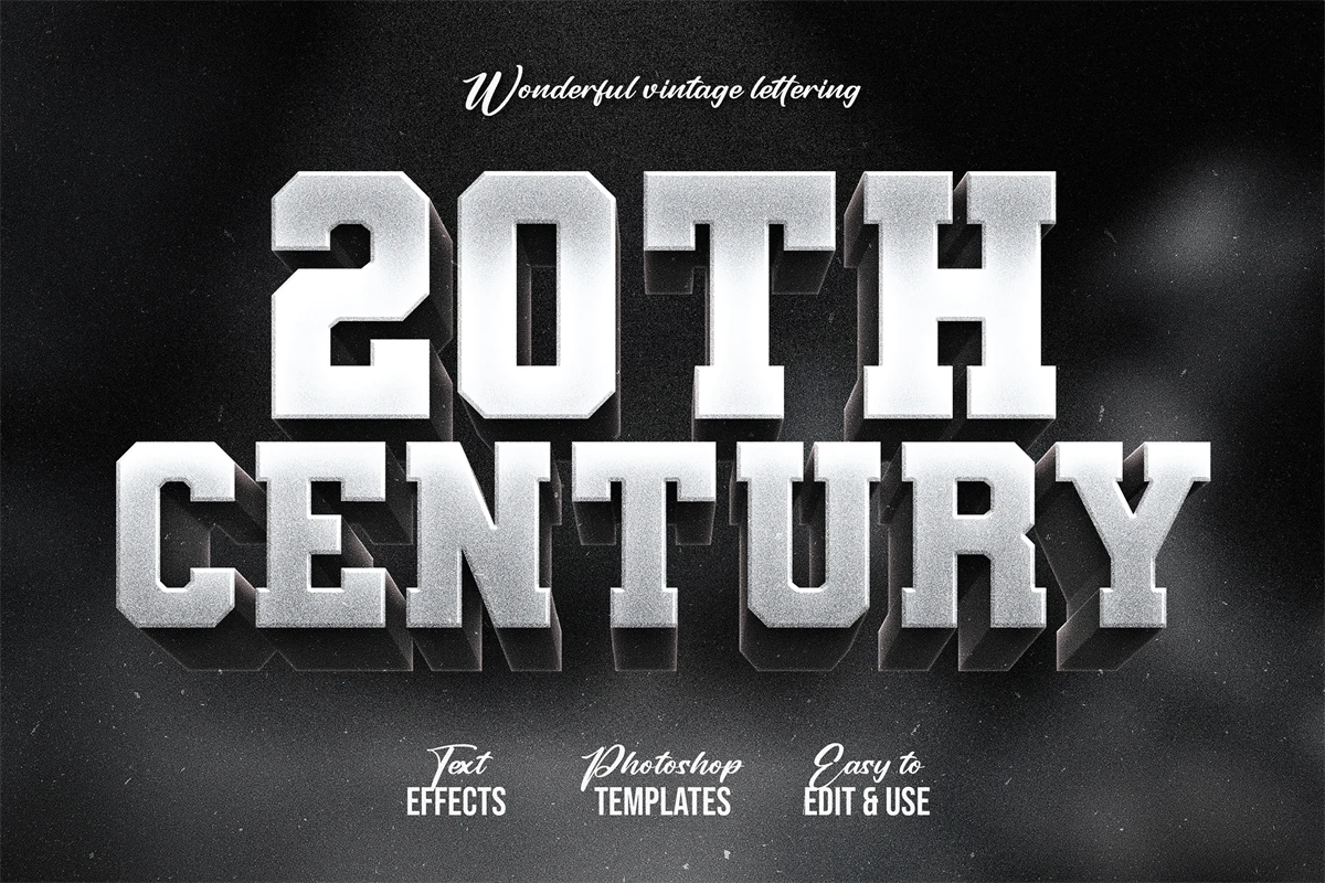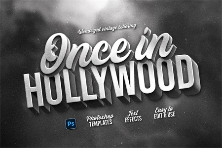 3D effects for your texts, logos, shapes in old movie titles style. Noir detective, gangster saga, scary movie style. You can use these 6 Photoshop templates for making cool retro lettering for posters, social media, video titles, Instagram and Facebook, promo, ads and more!