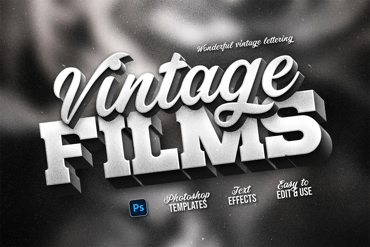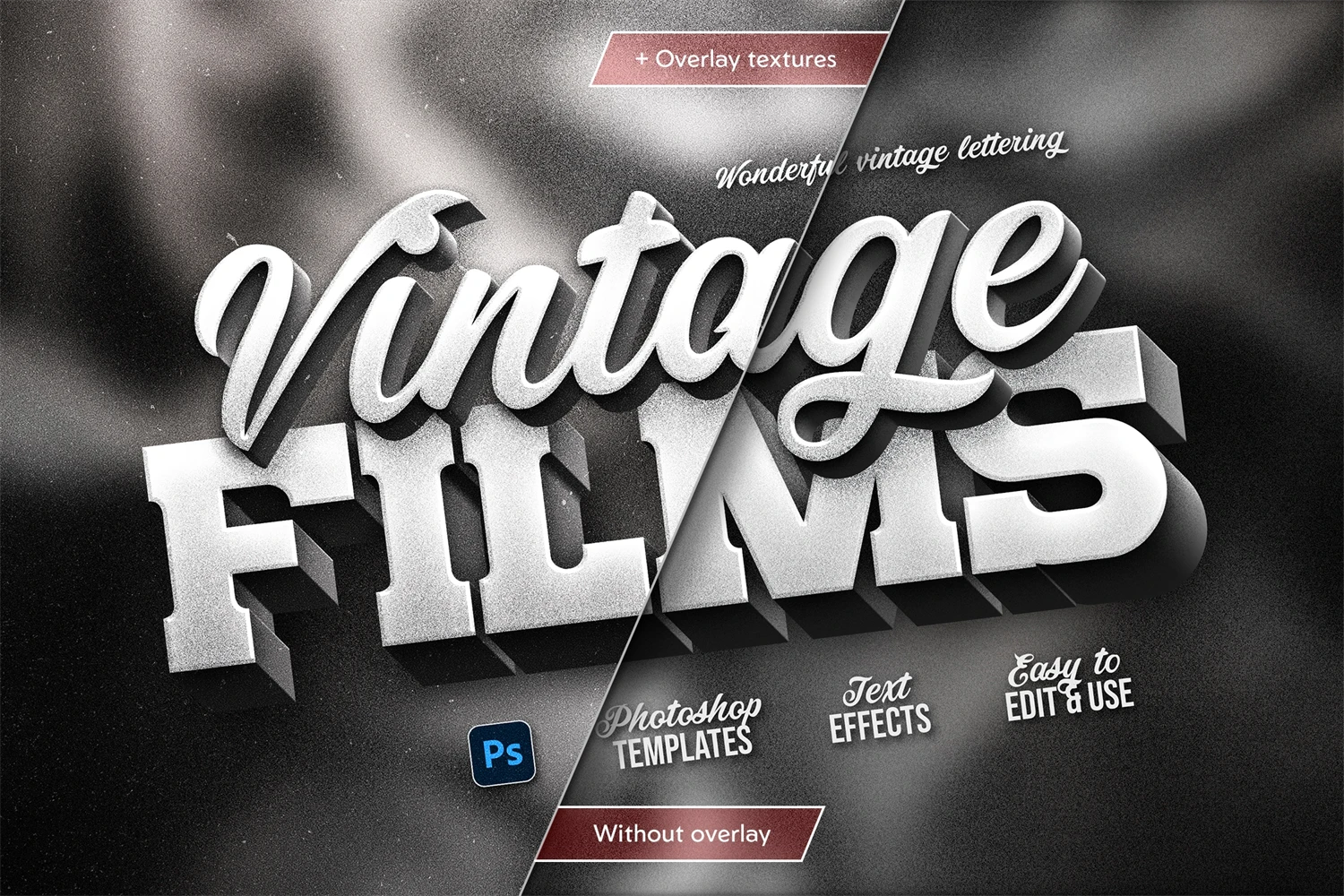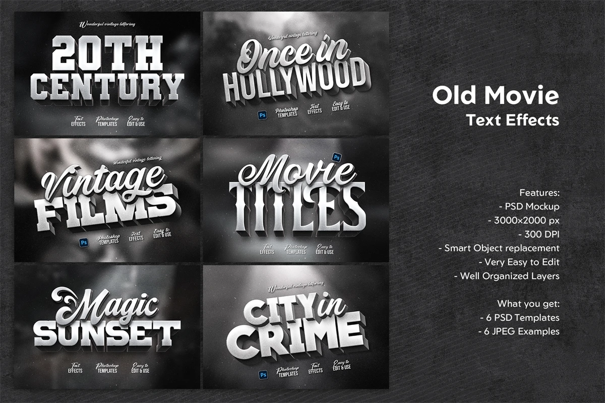 Old School Movie Text Effects look as authentic as possible with bold letters, monochrome colors, film grain overlays.