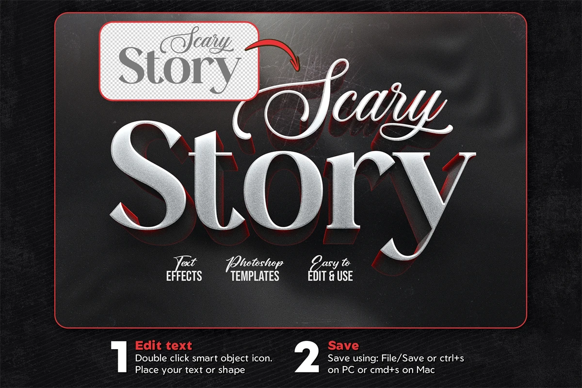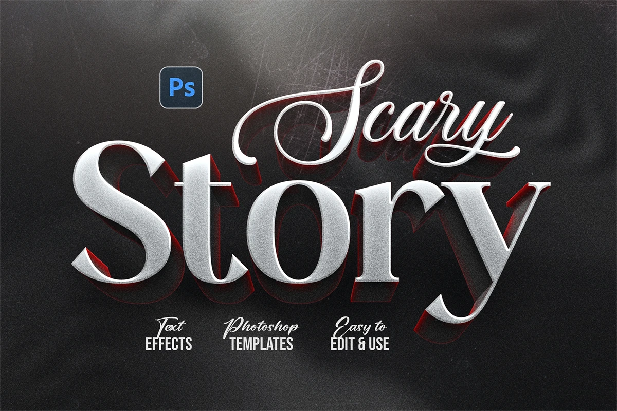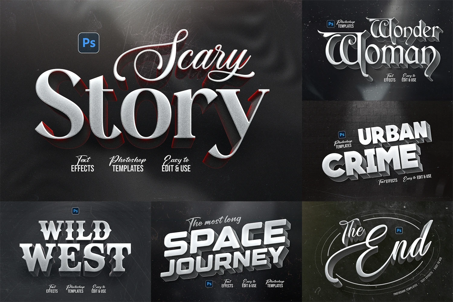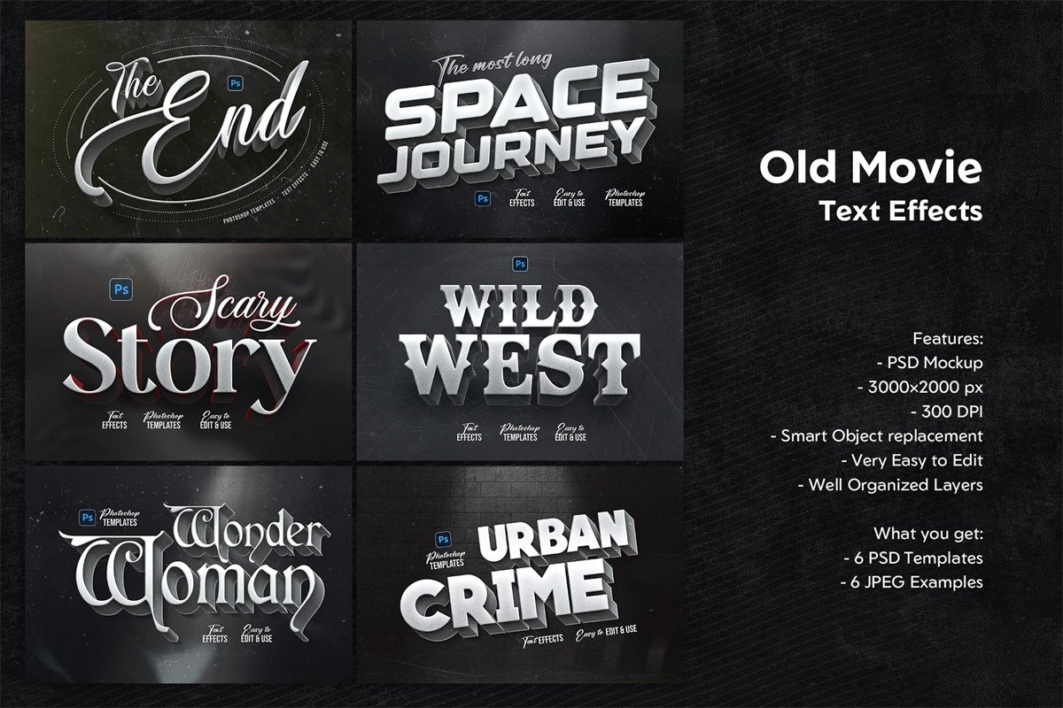 3D effects for your texts, logos, shapes in old movie titles style. Noir detective, gangster saga, scary movie style. You can use these 6 Photoshop templates for making cool retro lettering for posters, social media, video titles, Instagram and Facebook, promo, ads and more!