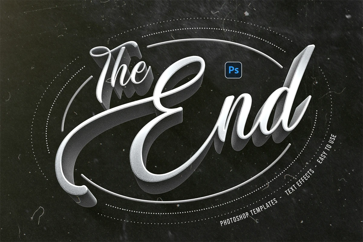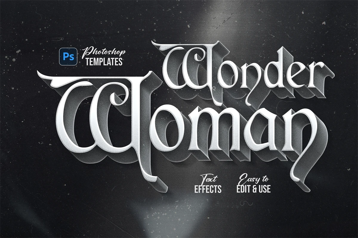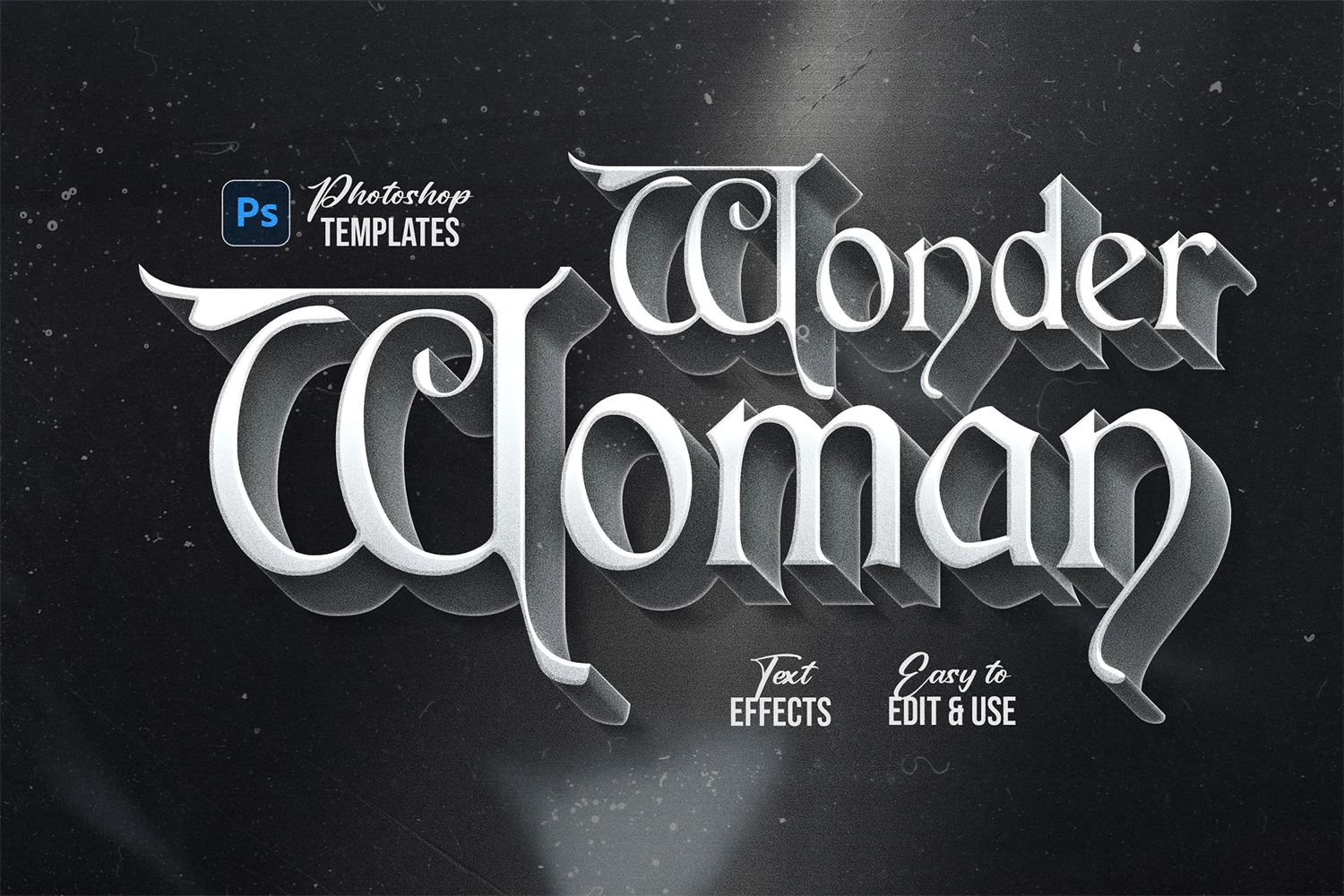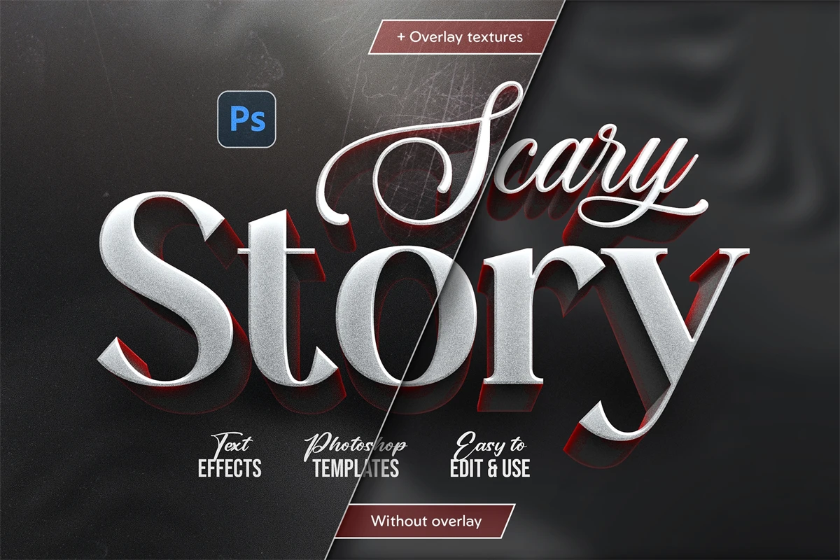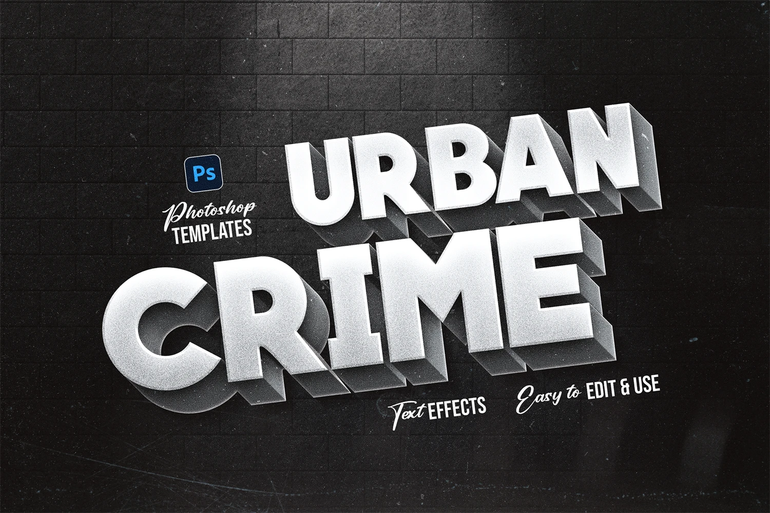 3D effects for your texts, logos, shapes in old movie titles style. Noir detective, gangster saga, scary movie style. You can use these 6 Photoshop templates for making cool retro lettering for posters, social media, video titles, Instagram and Facebook, promo, ads and more!