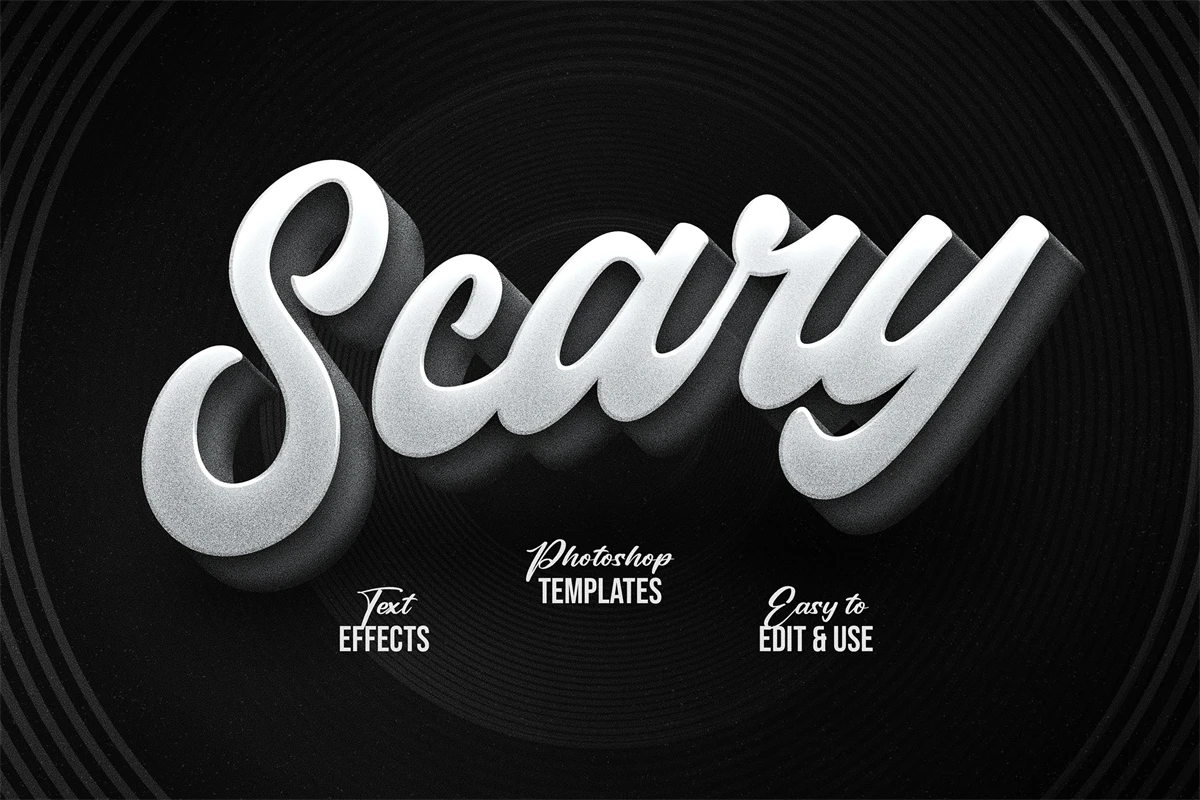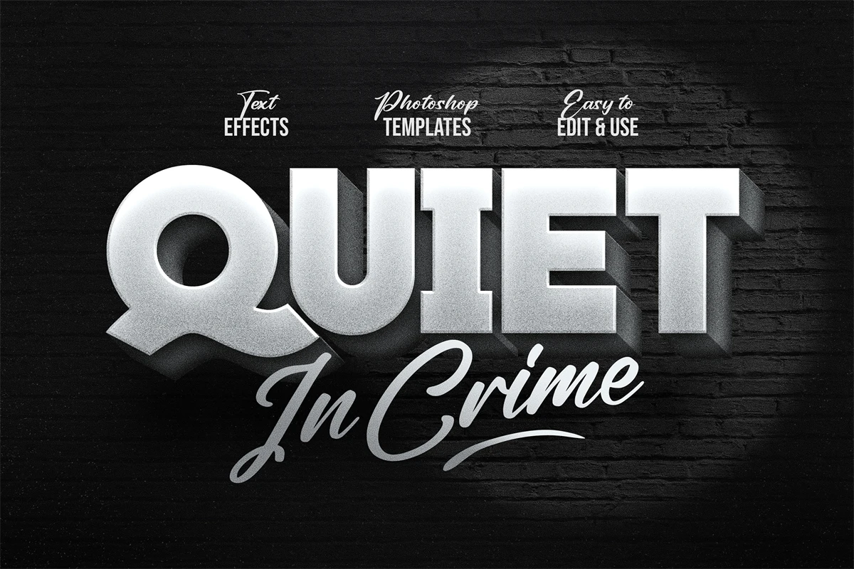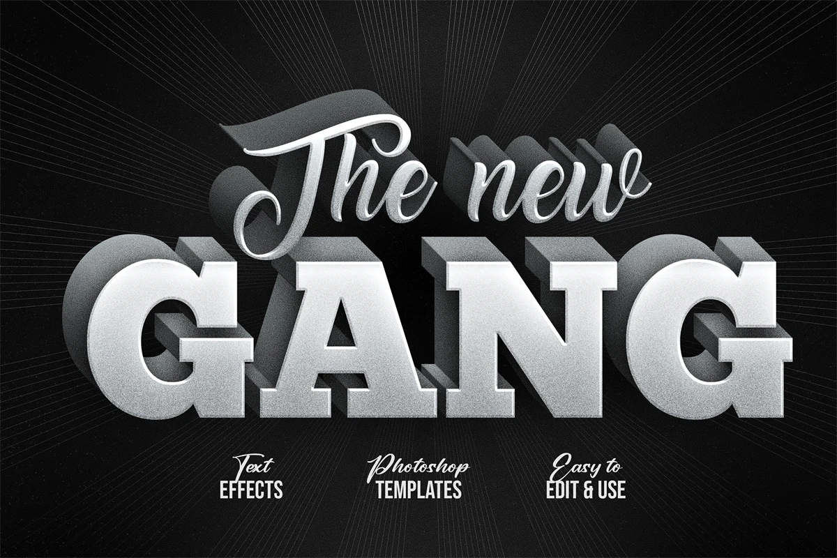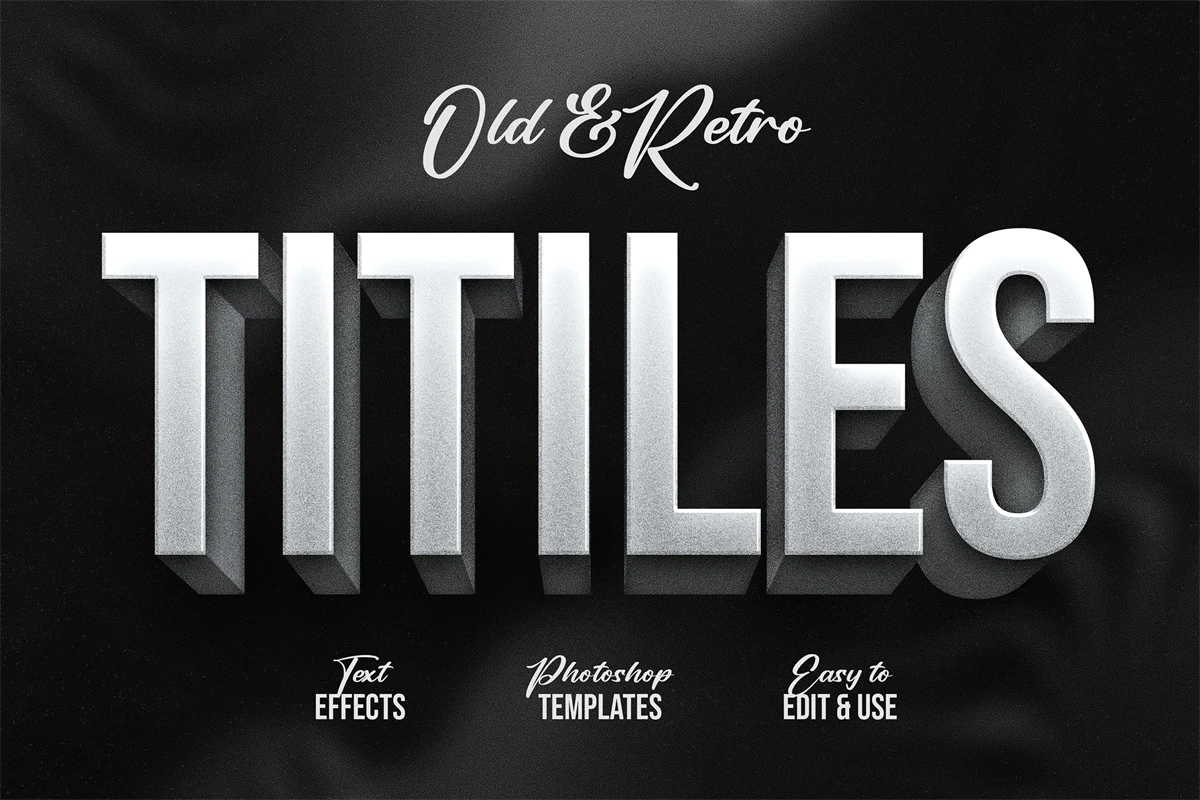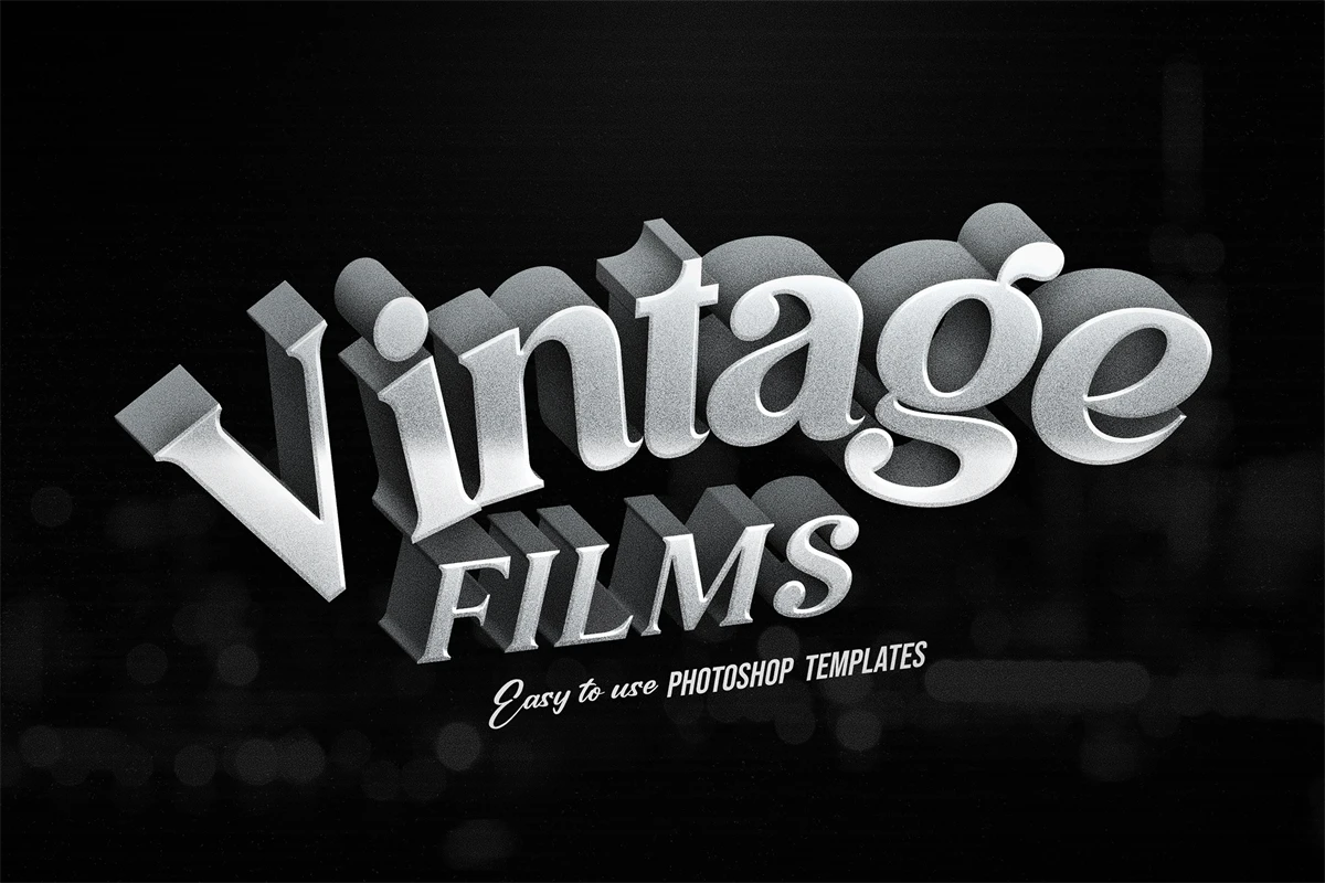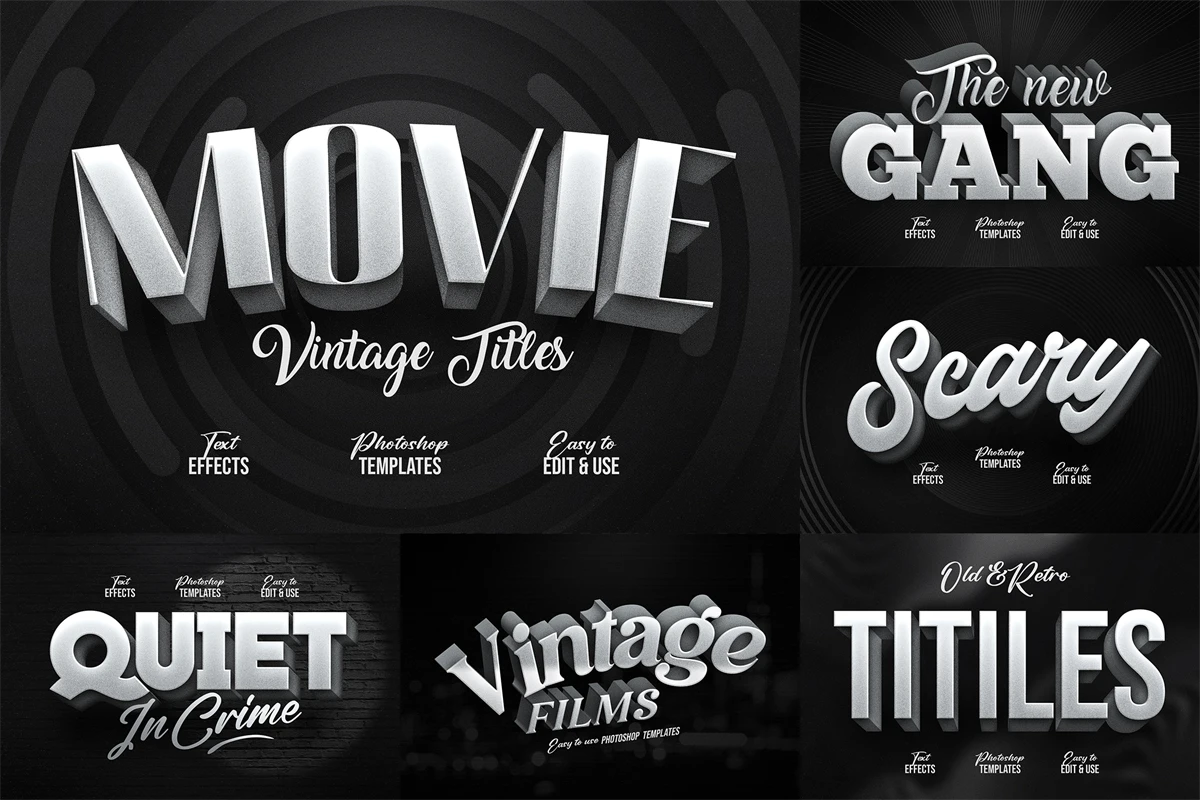 3D effects for your texts, logos, shapes in old movie titles style. Noir detective, gangster saga, scary movie style. You can use these 6 Photoshop templates for making cool retro lettering for posters, social media, video titles, Instagram and Facebook, promo, ads and more!