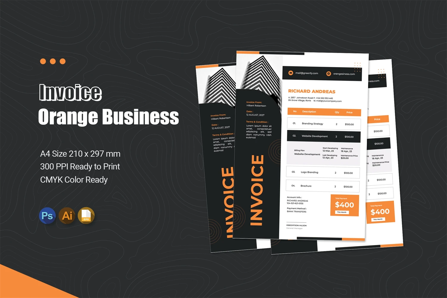 Use our invoices to make your bookkeeping easier and to impress your clients with an invoice display that has a modern, elegant design and strong typography. This invoice template is easy to use and customizable, making it perfect for any medium.