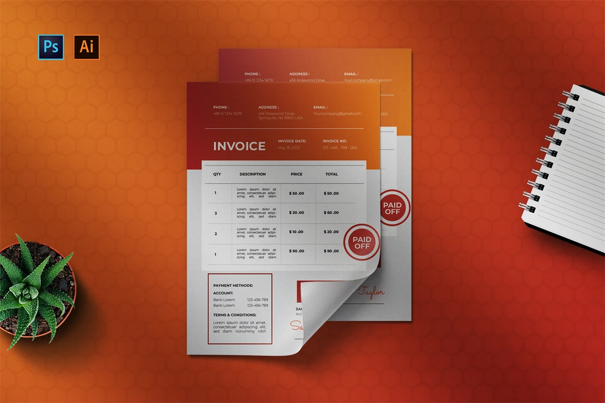 professional, up-to-date invoice templates that can be used for personal, business, or company billing. You can easily change these template files. You can quickly change the text, fonts, and colors with just a few clicks to create your own content and color scheme. This invoice template will make it easy and quick for you to make an invoice.
