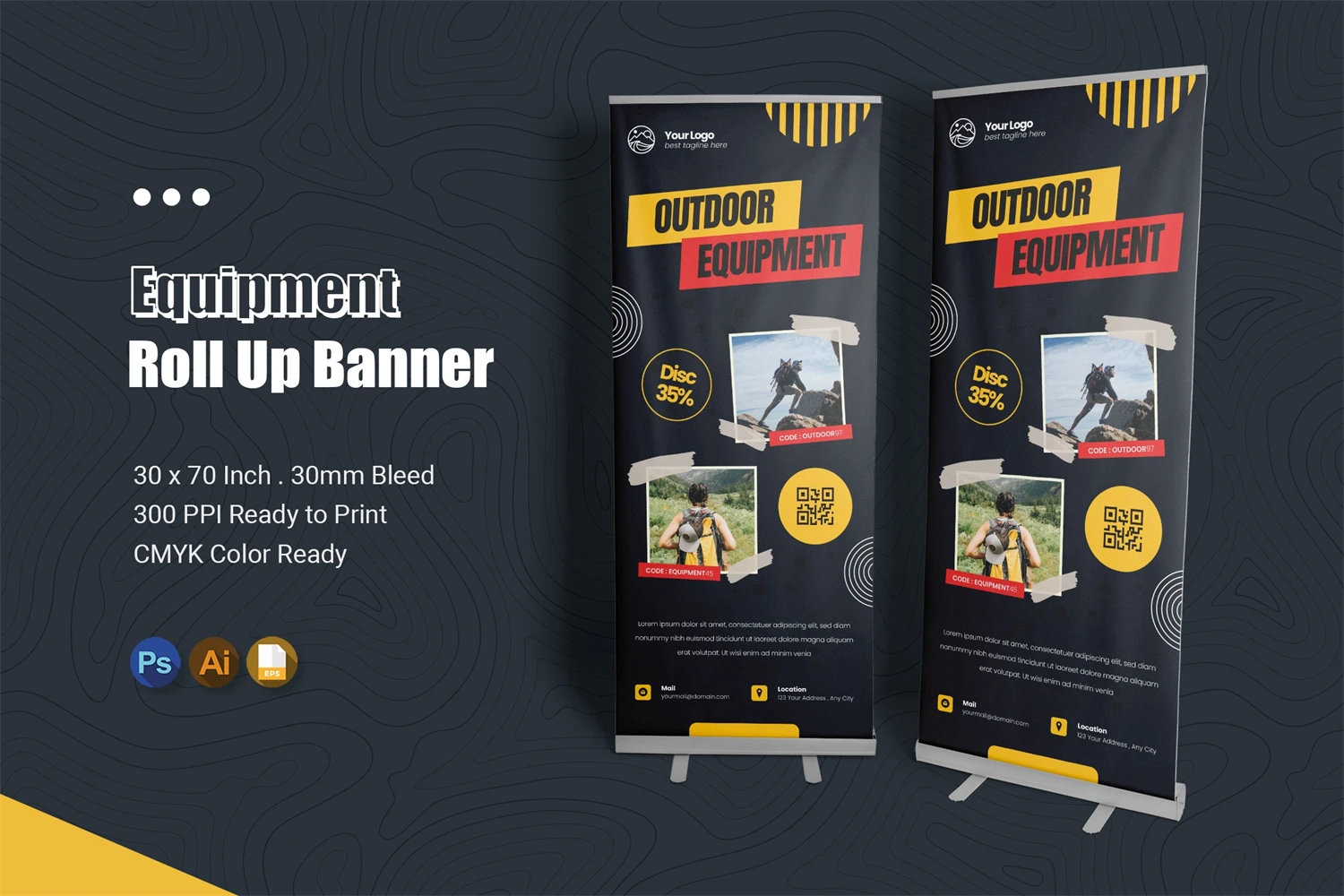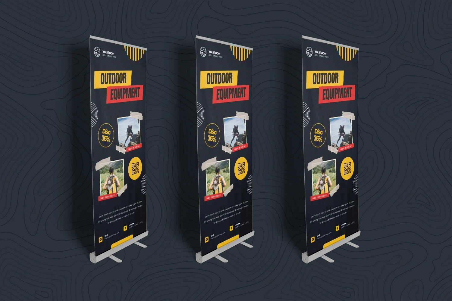 Our roll-up banner template tells your brand's story at a glance. This design stands out and can be used to showcase pictures and content effectively.