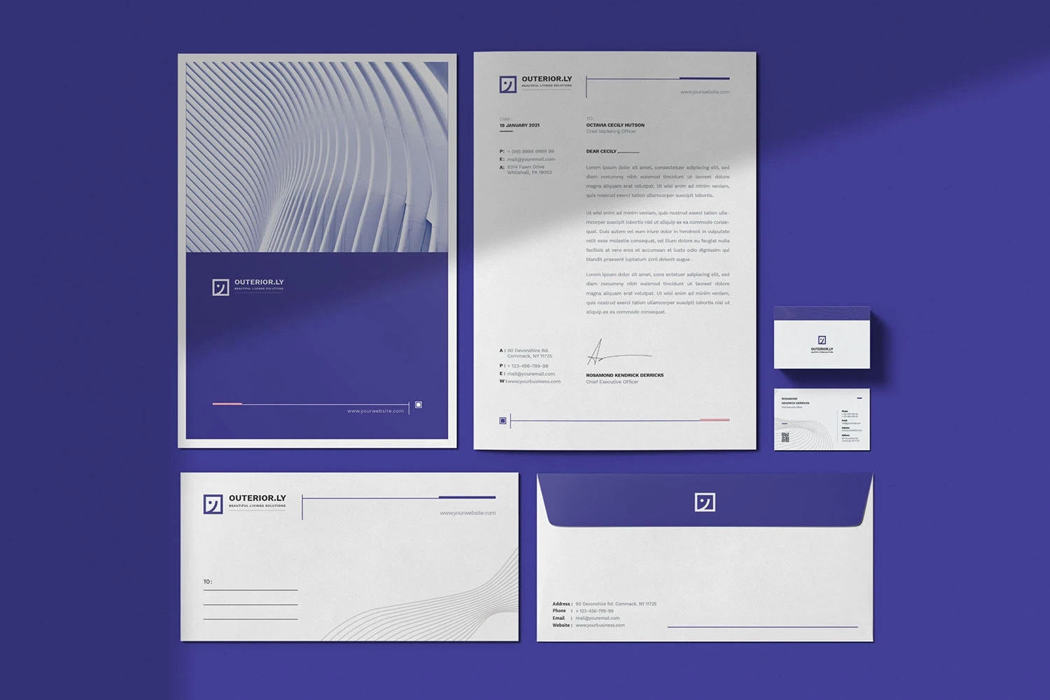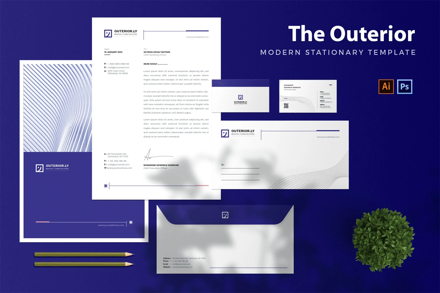Outerior - Stationary. This template is great for your business and this design will make your interested, elegant, and easily editable according to your needs. I hope you enjoy for this stationary.