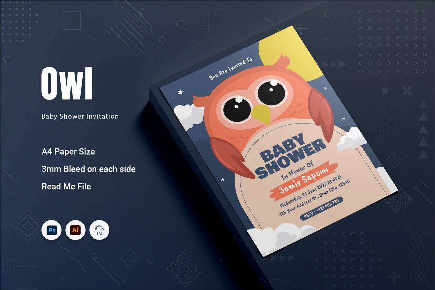 A **Owl Baby Shower Invitation** can be used for your baby shower or baby's birthday. You could also use it as a promotion for baby and parent photography services. Match the needs, whether personal or business. This template is easy to adjust and easy for you to edit according to your taste.