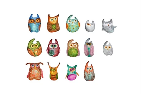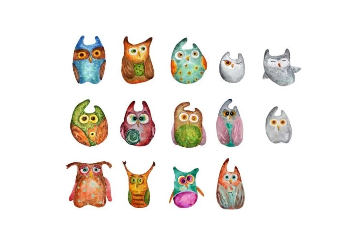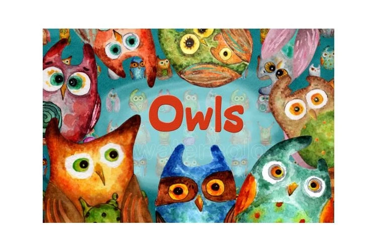 A collection of watercolor drawings of cute owls, each element is on a transparent PNG background . 13 owl files 5000x5000 px 16x16in 300dpi , 1 PNG files patern 5000x5000px.1616 in 300dpi