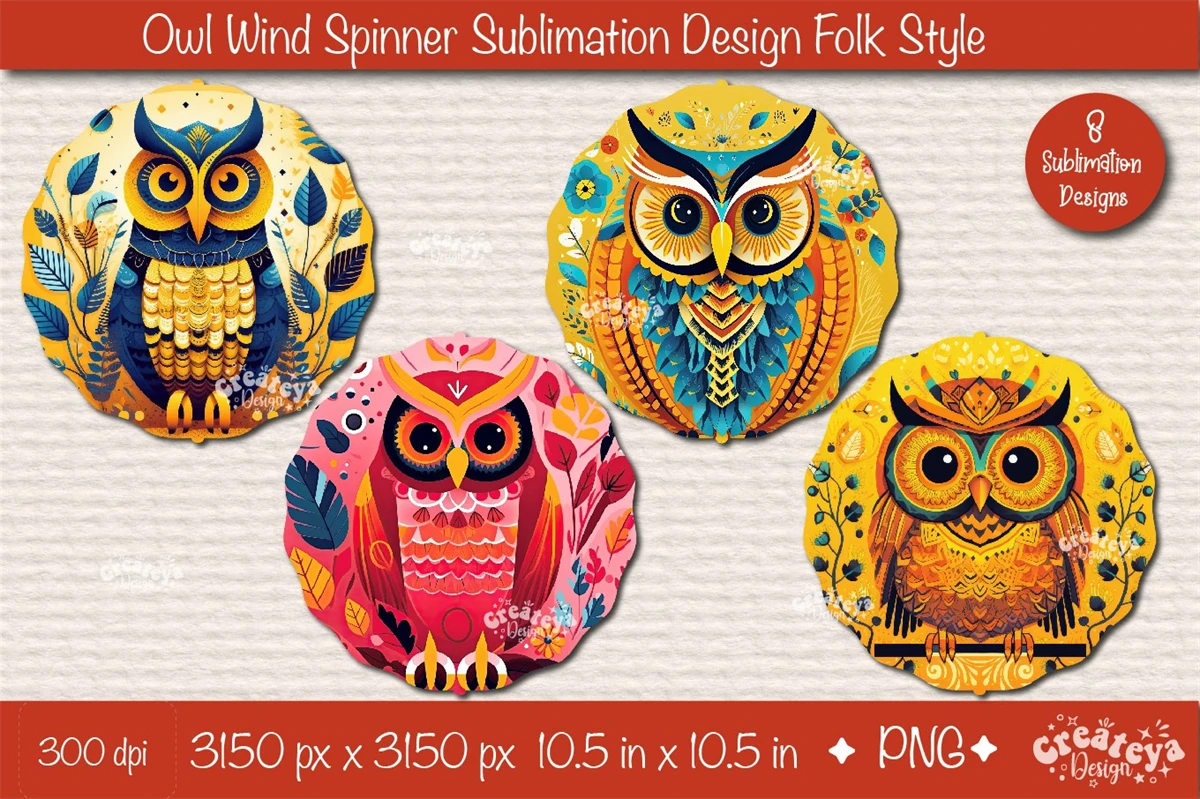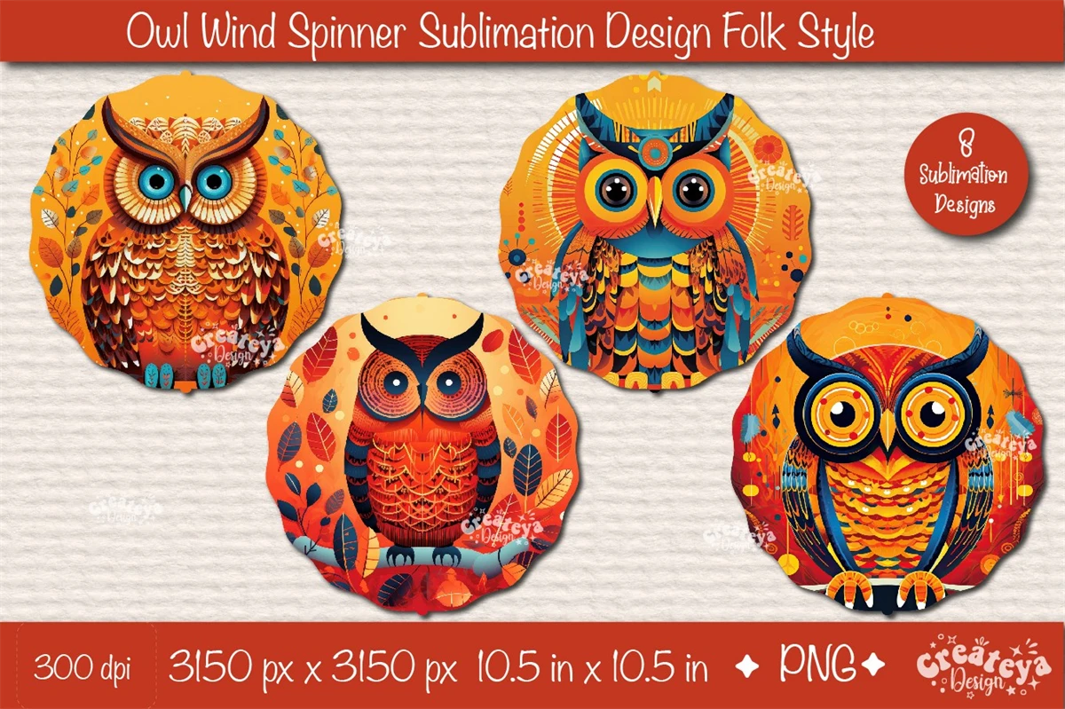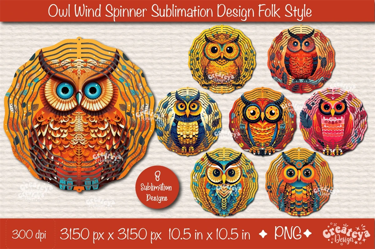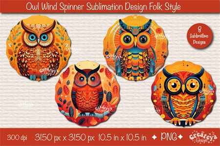 Owl Wind Spinner sublimation with a beautiful Owls in Folk style. Wind Spinner sublimation bundle PNG. This Bundle contains 8 designs.