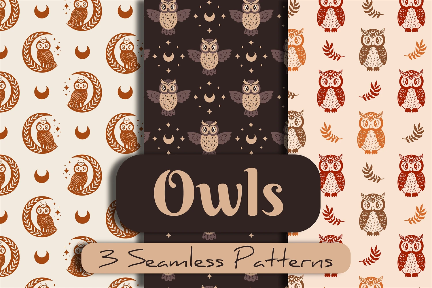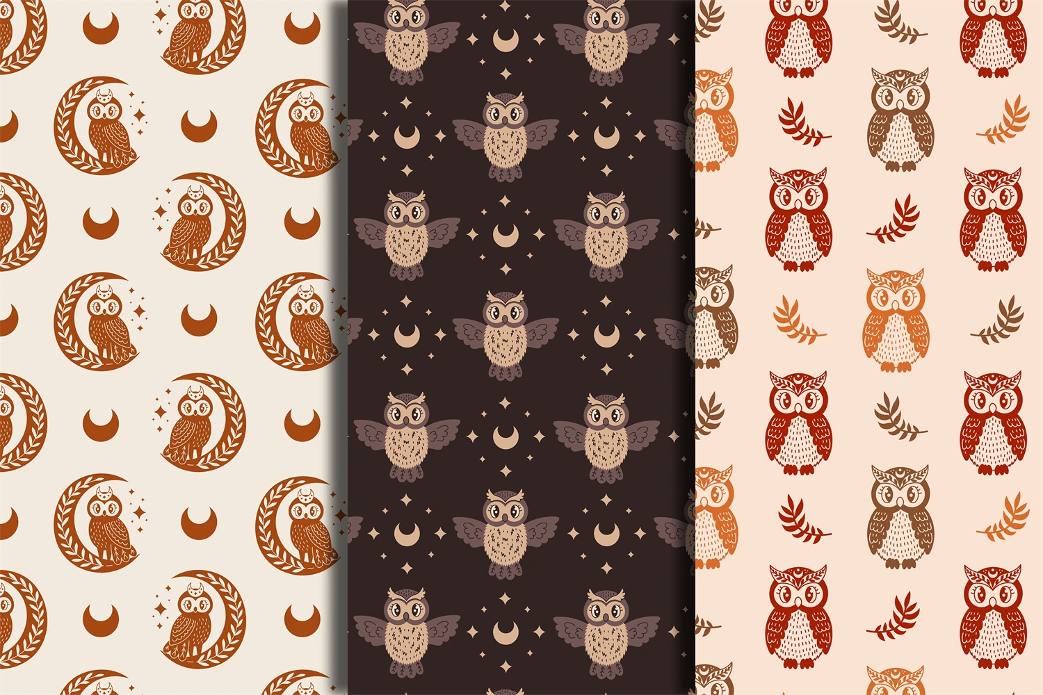 Cozy seamless patterns bundle with cute owl characters. Mystical and fairytale backgrounds with birds in doodle style. Colorful childish nature design with wild animals, moon, crescent, stars, branches, twigs. Bohemian owl, night owl and forest owl decorative digital papers. Repeat vector illustration.