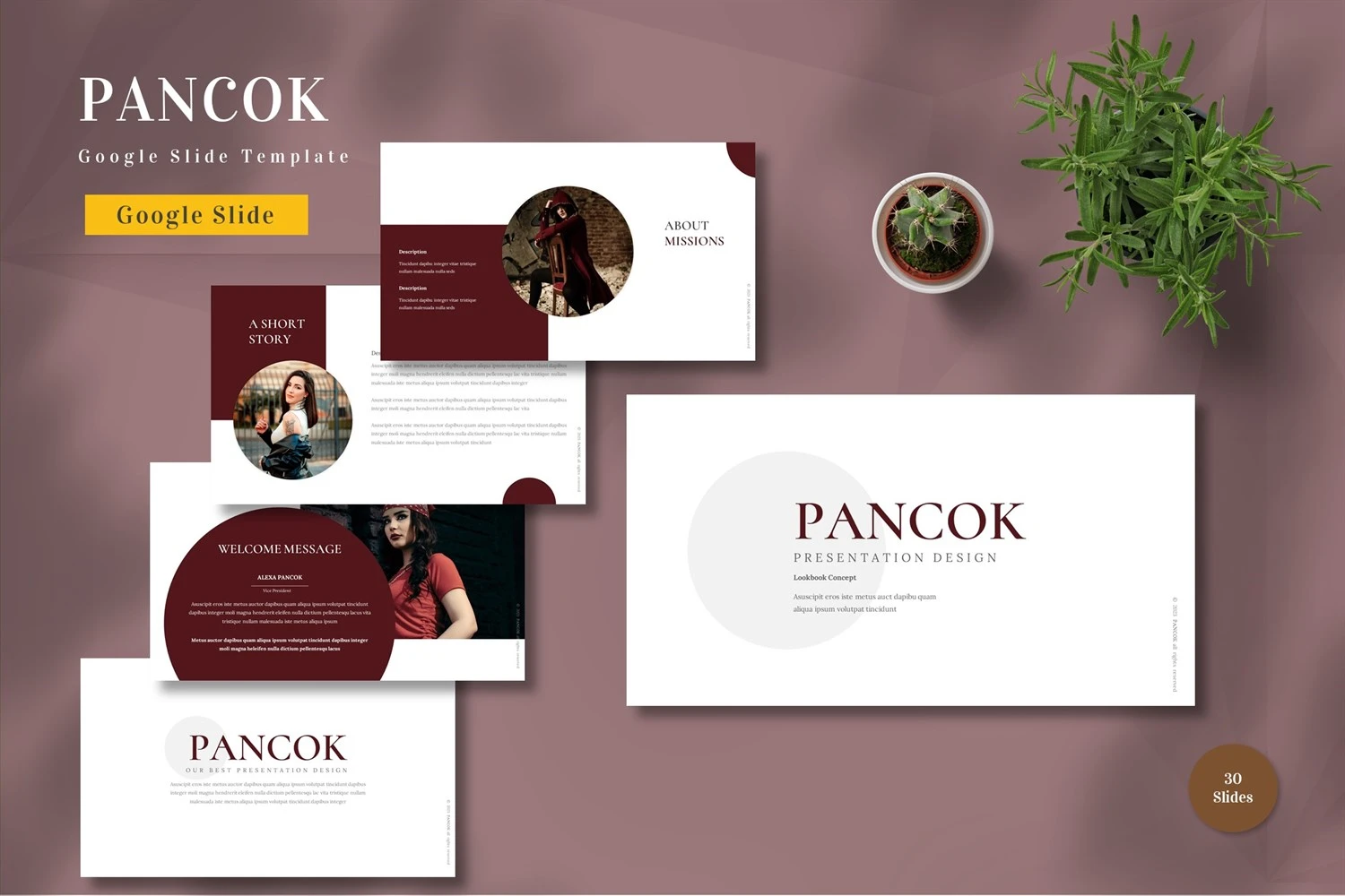 Get it now! **Pancok - Google Slide Template** for All Business and Personal Needs All elements on this template are editable; input your content, replace your image with a placeholder, change the color, and all presentations include an animated slide to present your slides.
