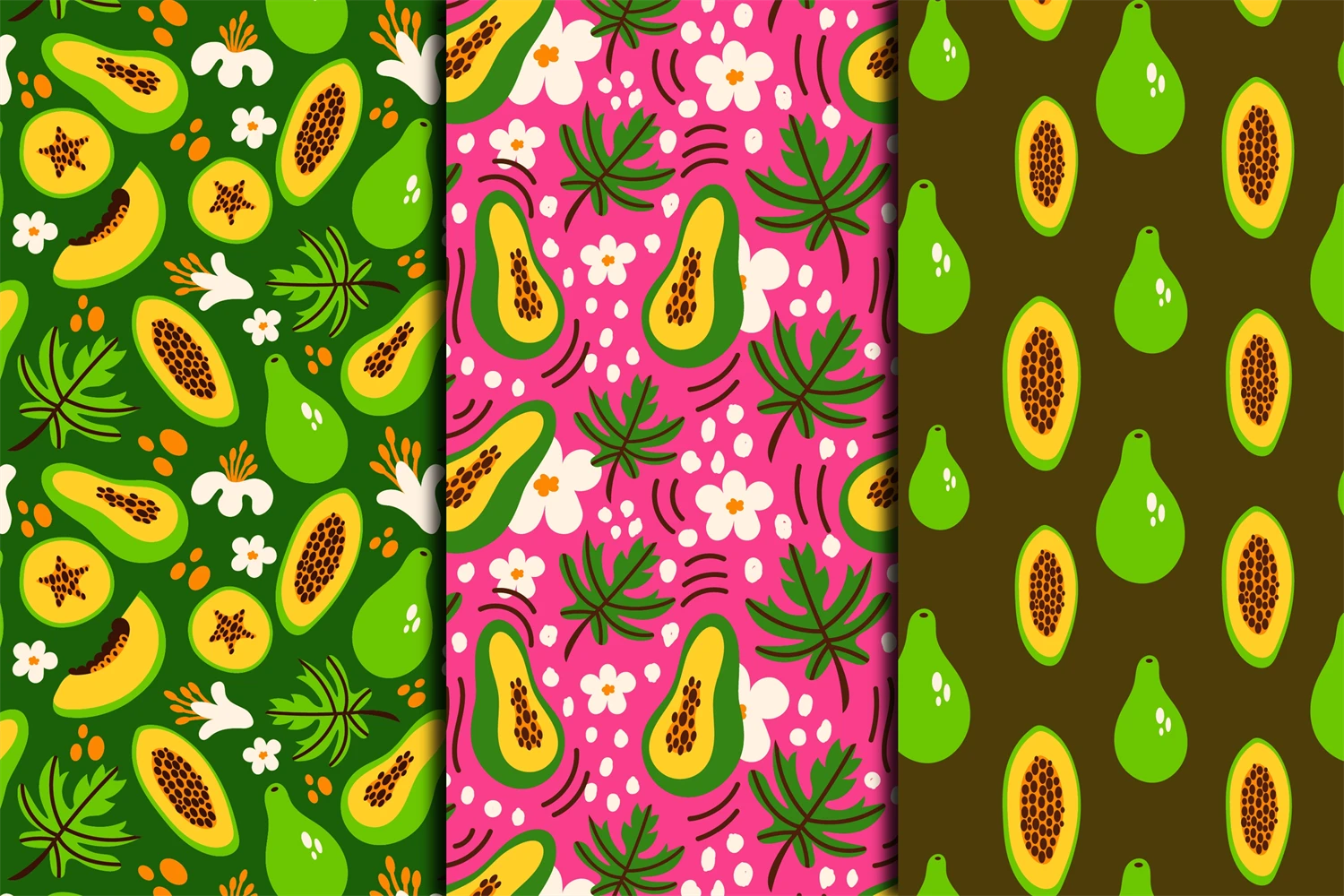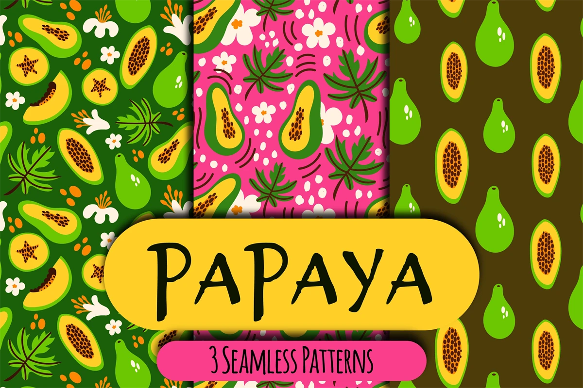 Summer tropical seamless patterns with exotic fruit parts, flowers, leaves. Vibrant colored hand-drawn digital papers. Endless backgrounds with nature elements. Modern papaya botanical repeat illustrations for fabric, textile, wallpaper, greeting card, wrapping paper, surface design, scrapbooking, seasonal decoration, tumbler, kitchen, etc.