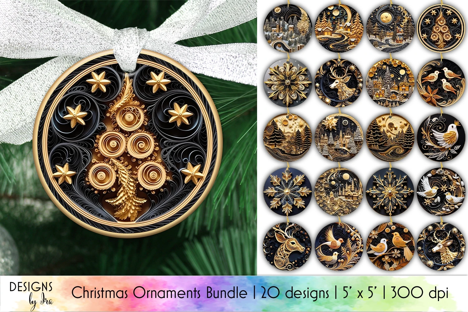 Christmas ornaments and round gift tags PNG with paper quilling effect, printable designs, bundle of 20 round ornaments designs.