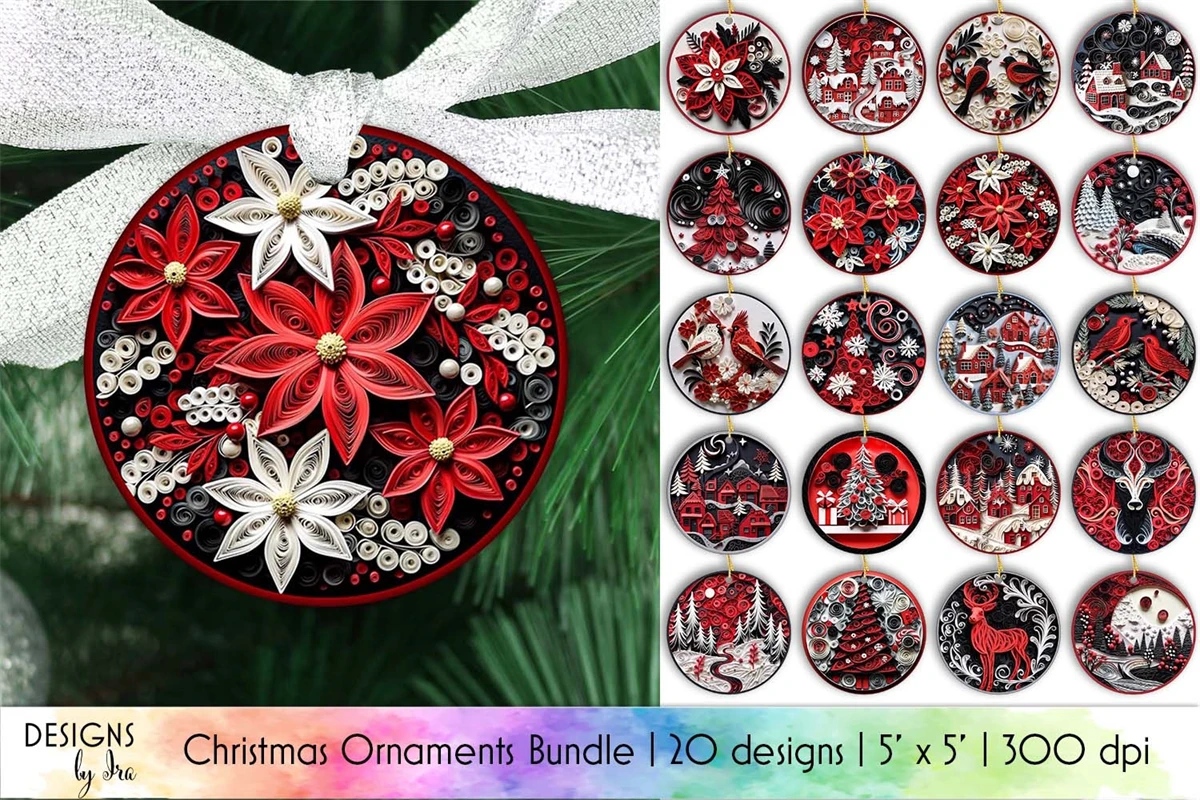 Christmas ornaments and round gift tags PNG with paper quilling effect, printable designs, bundle of 20 round ornaments designs.