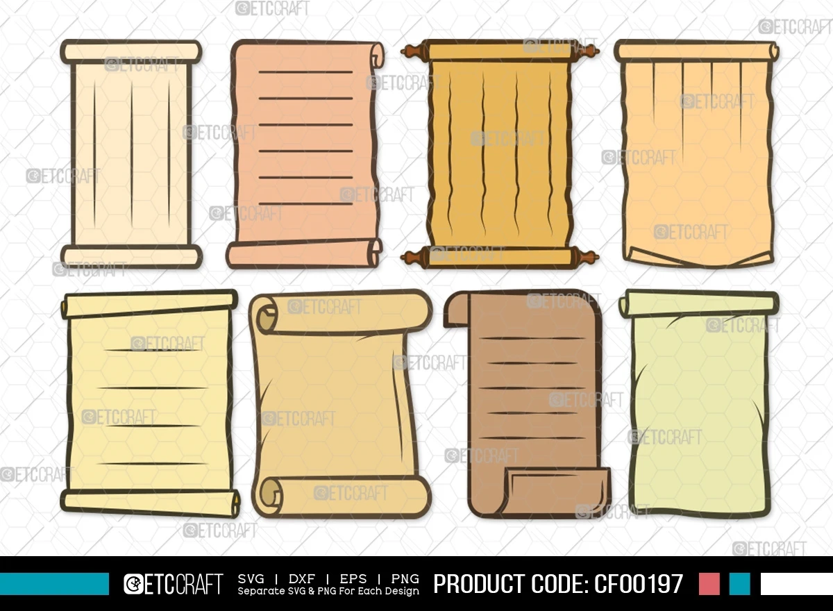 Enhance your designs with the allure of history and elegance using the Paper Scroll Clipart Vintage Papyrus Ancient Letter Parchment SVG Cut File Bundle. Download now and infuse your projects with a touch of vintage sophistication!
