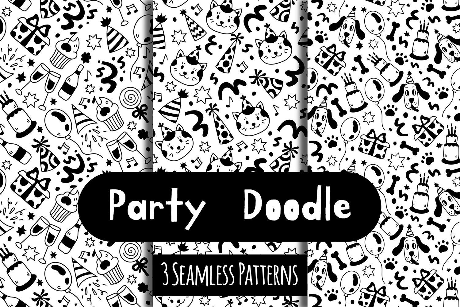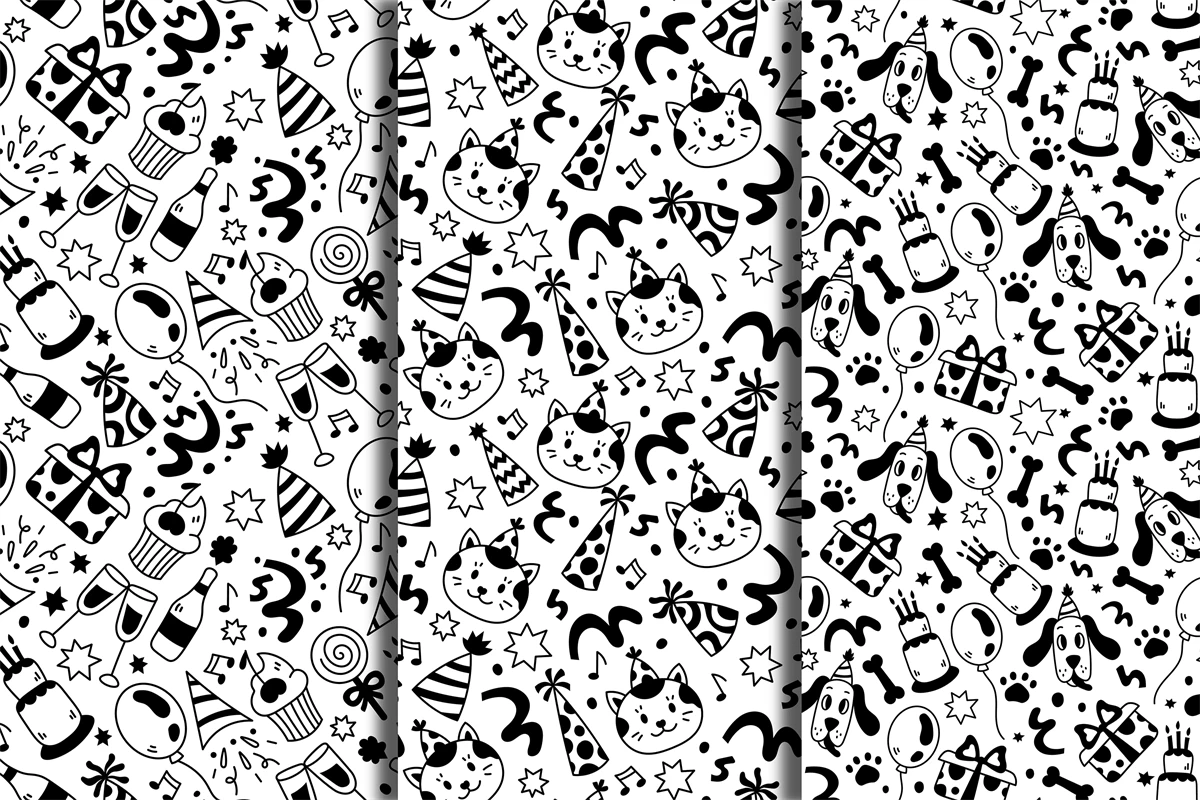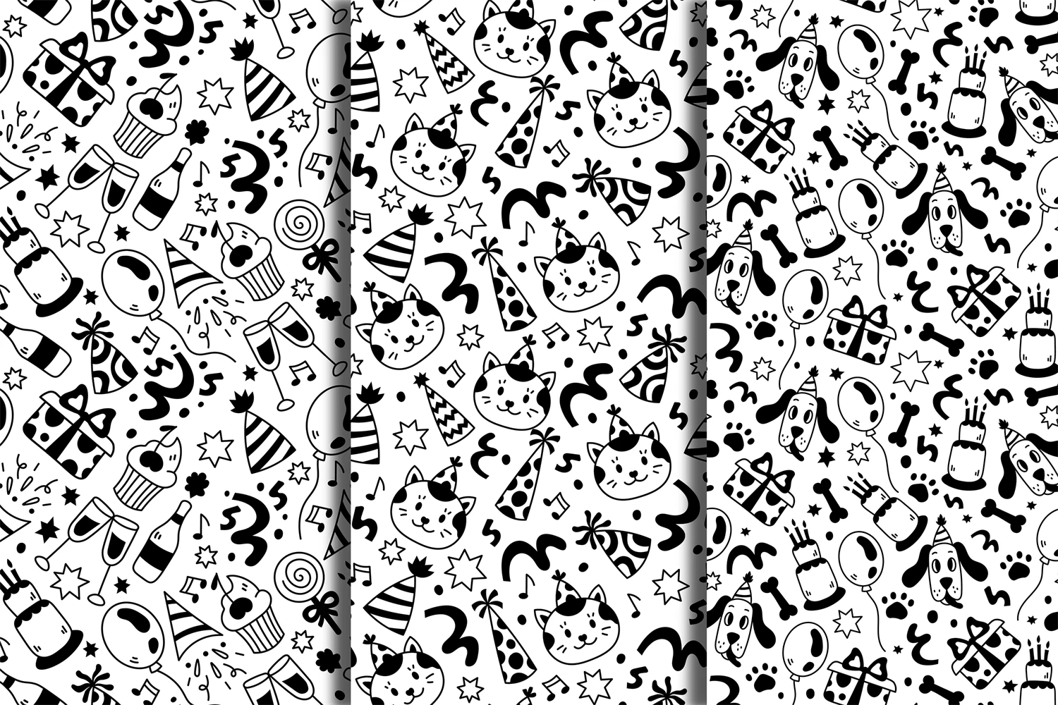 Trendy doodle styled seamless patterns, digital papers and endless backgrounds with funny line art elements for holiday, party, celebration and pets design. The first pattern with festive drawings and traditional fun symbols: flapper, party hat, balloon, confetti, champagne and sweets. The second one with a funny cat. And the third one with a happy dog in party hat. Vector illustration.