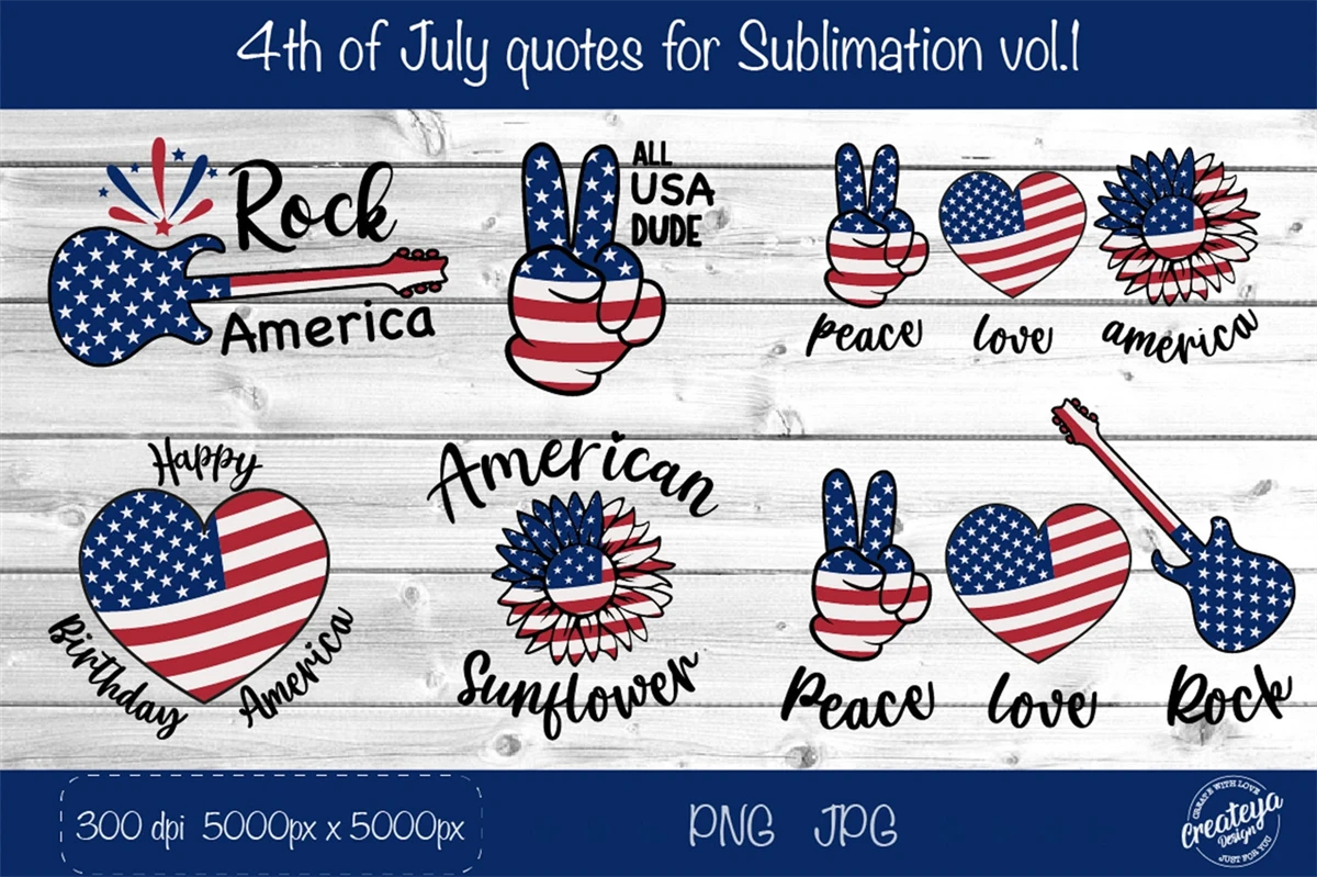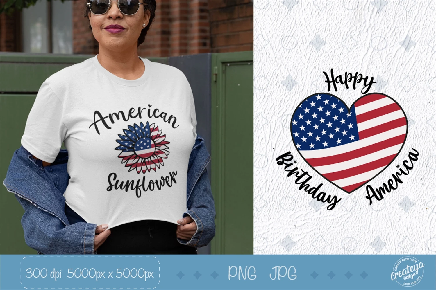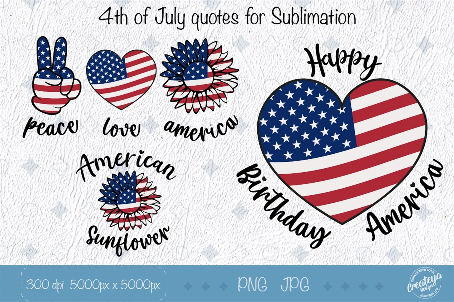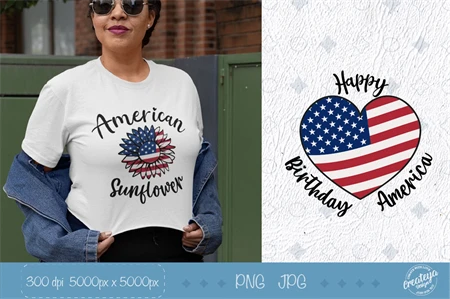 Patriotic and 4th of July quotes American Sunflower, Happy Birthday America, Rock America, Peace Love Rock, Peace Love America you can use it for t-shirts, mug, tote, bag and other decoration.