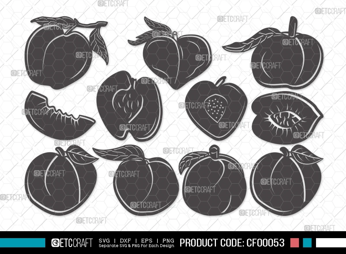 Experience the vibrant essence of summer with our "Peach Silhouette Summer Fruit Slice" SVG cut file bundle. Immerse yourself in the delightful world of peaches, encapsulating the spirit of the season, perfect for infusing a touch of freshness into your creative projects.