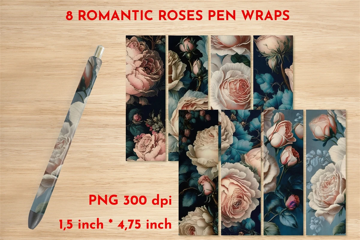 Romantic roses pen wraps bundle is small bundle of 8 pen wrap sublimation designs with size 1,5 inches * 4,75 inches. Also you can use these pen wrap designs as bookmark template and for other your projects.