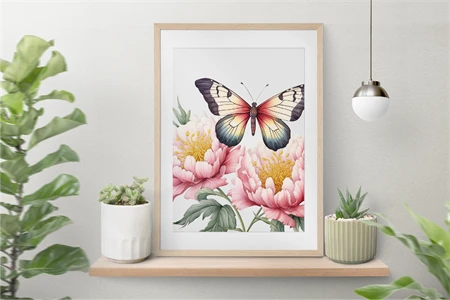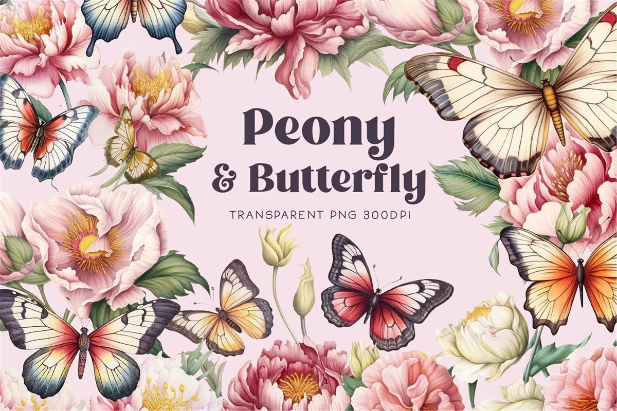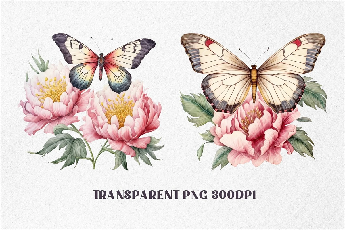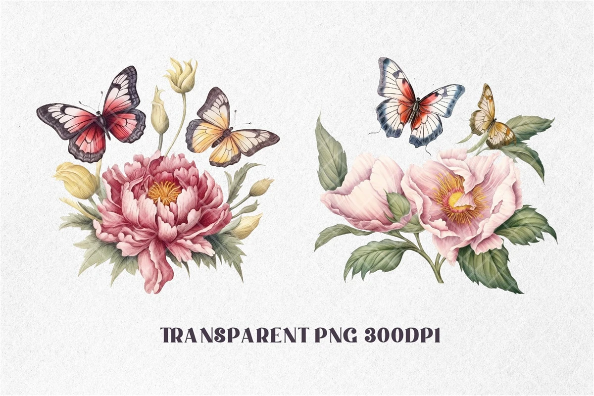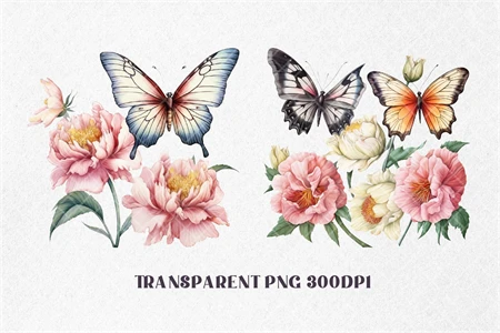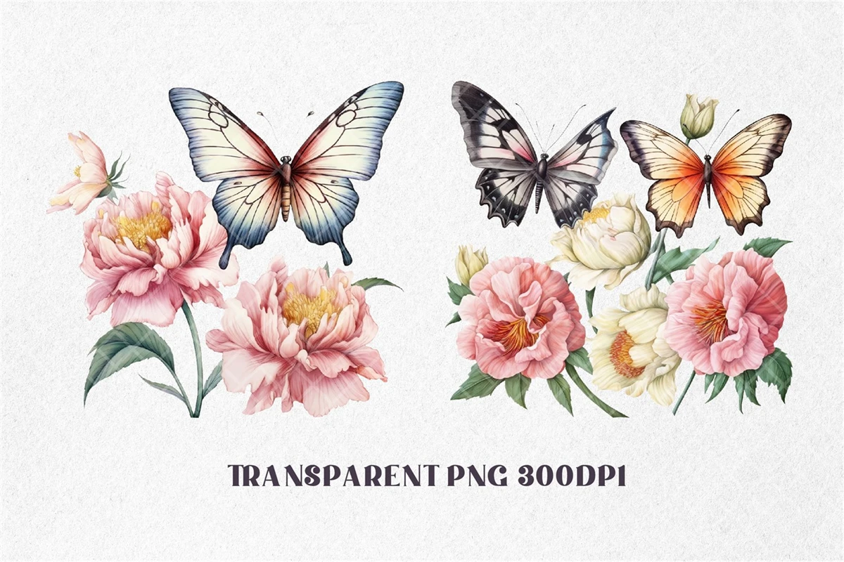 Peonies Flowers with Butterflies Watercolor, Florals Clipart. All elements are high-resolution (300dpi) PNG files with transparent backgrounds.