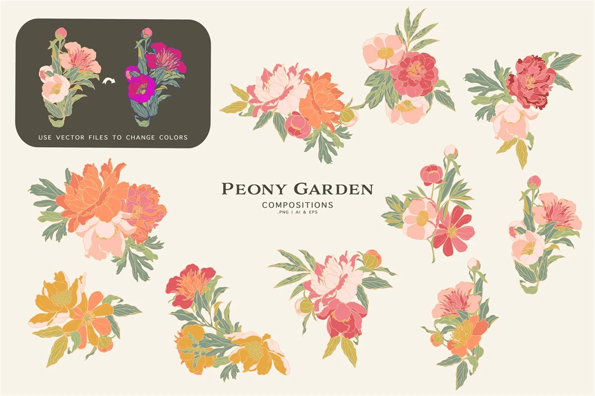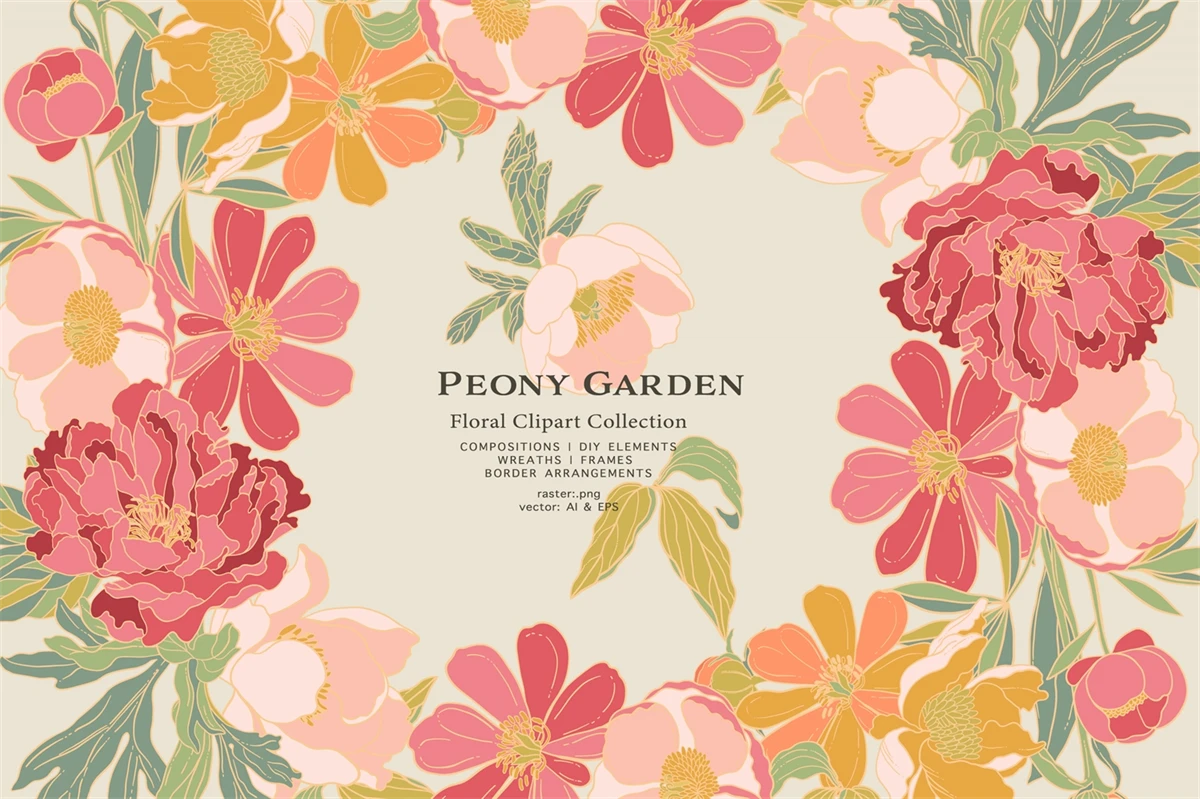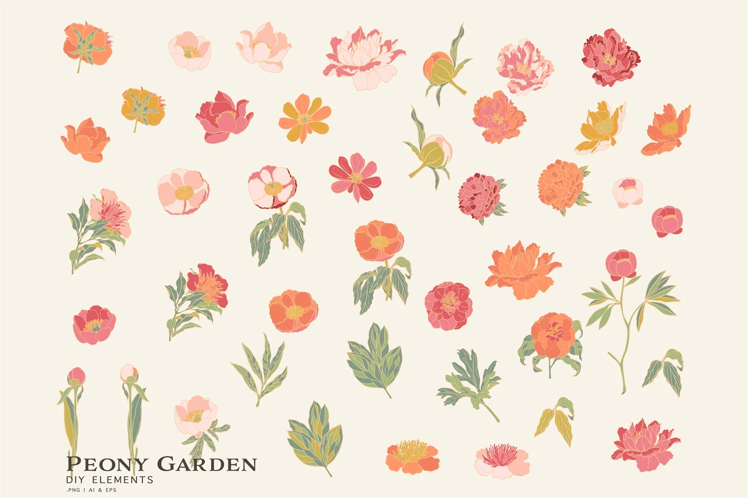 Beautiful hand-drawn peony clipart collection, comes with a vector and raster option. Each image is on a transparent background, making it easy for you to use on any background you choose. Use it to create wedding invitations, posters, greeting cards, blogs, logos, websites, stationery, and more!
