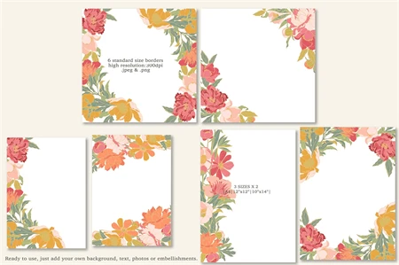 6 pre-made standard-size borders.: 3 sizes: two A4s, two 10x14