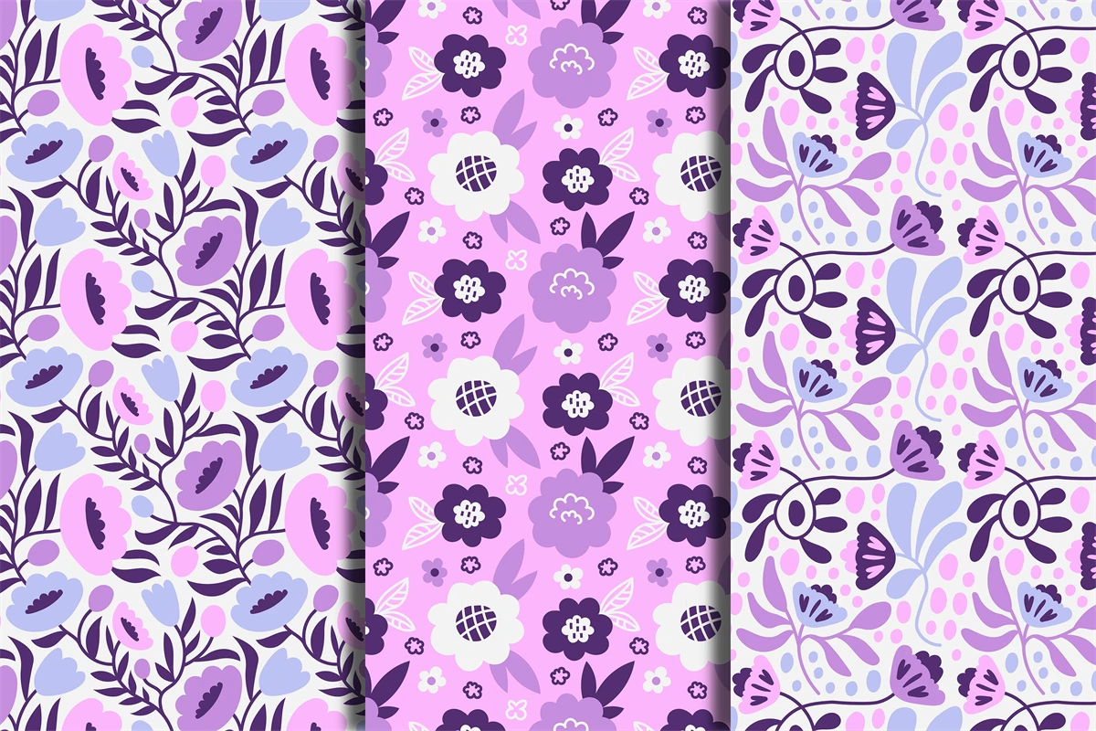 Peony collection includes 3 beautiful and cute floral seamless patterns with pink and purple wavy flowers and leaves in trendy Matisse minimal style. Decorative playful ditsy wallpapers with groovy garden flowers, bright blossoms, dots, branches and twigs. Natural endless backgrounds are perfect for greeting card, fabric, textile, wedding, home decoration, etc.