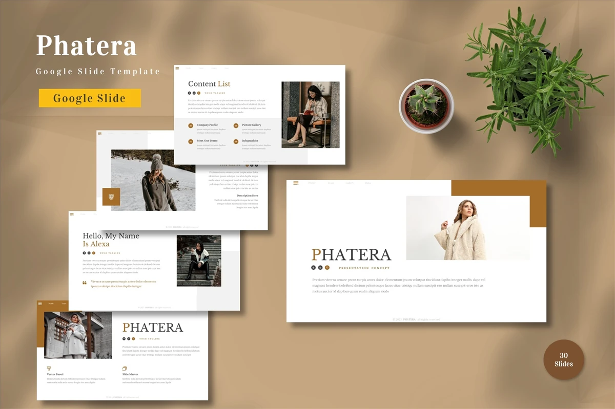 Get it now! **Phatera - Google Slide Template** for All Business and Personal Needs All elements on this template are editable; input your content, replace your image with a placeholder, change the color, and all presentations include an animated slide to present your slides.