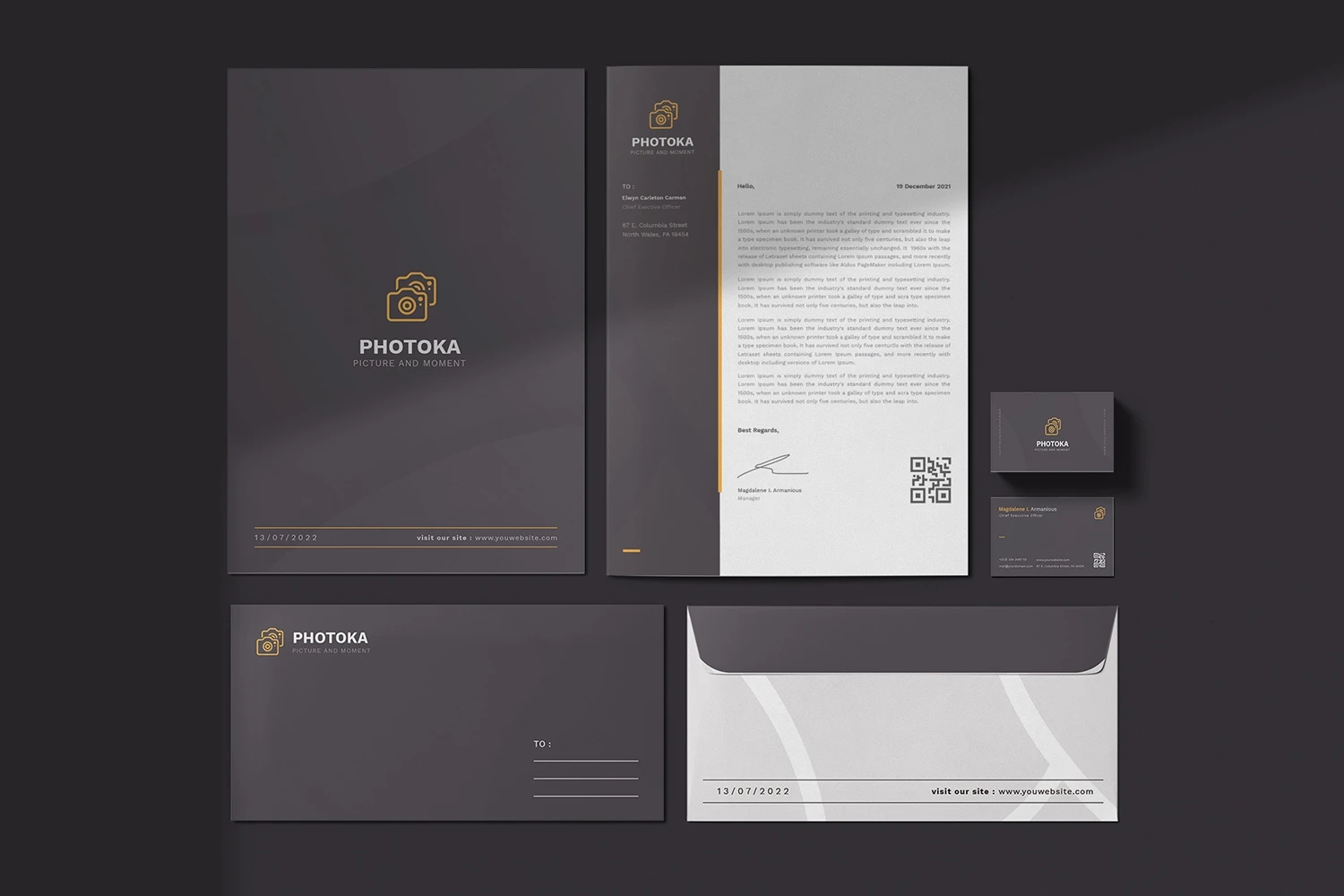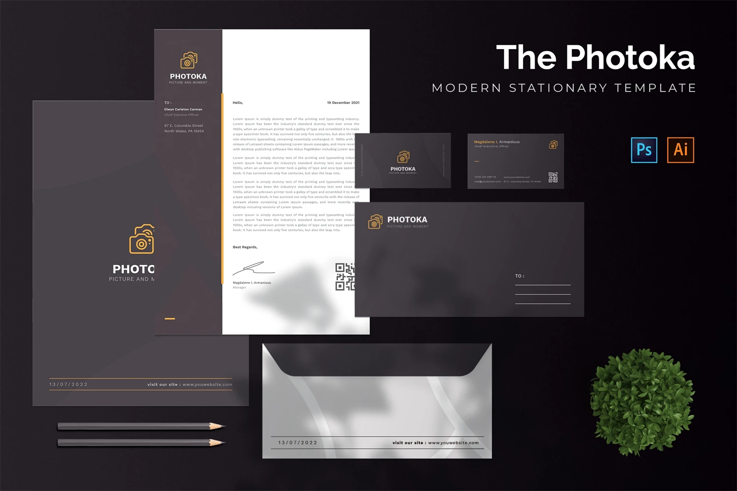 Photoka - Stationary. This template is great for your business and this design will make your interested, elegant, and easily editable according to your needs. I hope you enjoy for this stationary.