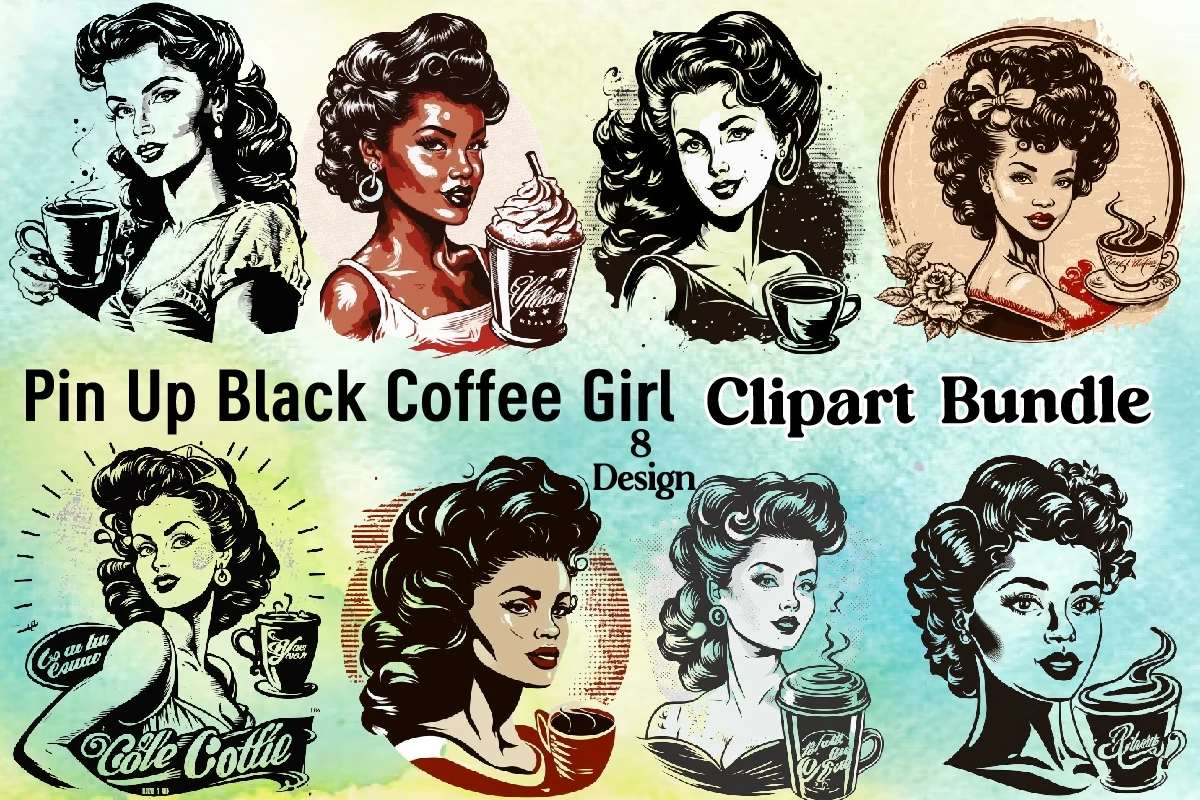 Watercolor Pin Up Black Coffee Girl Clipart PNG Bundle