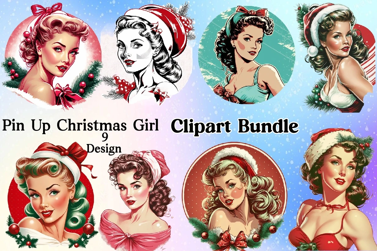 Watercolor Pin Up Christmas Girl Clipart PNG Bundle